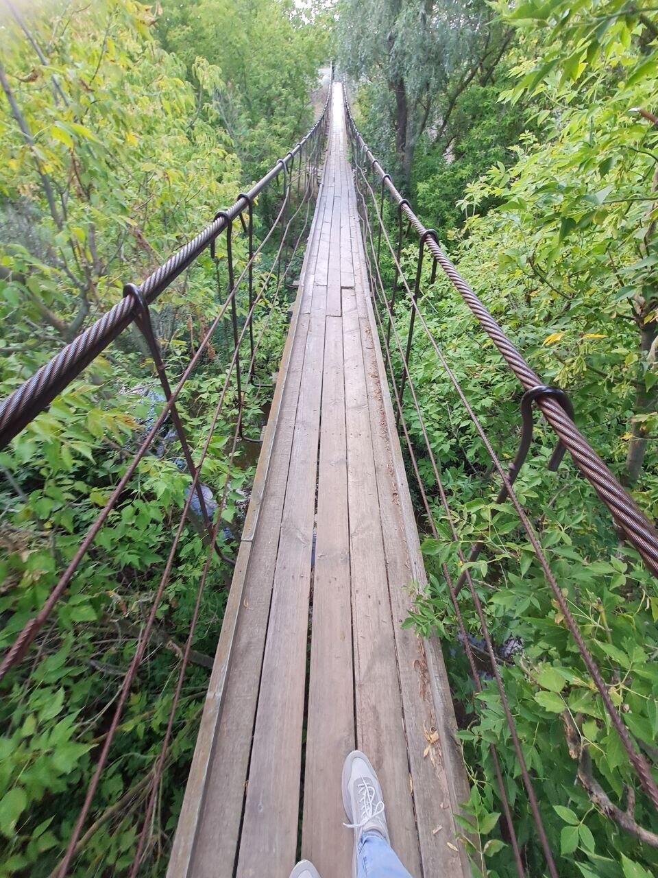 Под ногами скрипят потёртые доски, а вертикальные тросы, покрытые ржавчиной, издают резкие звуки. Деревянная конструкция начинает заметно колебаться, и не только под тобой, но и на другом конце моста.