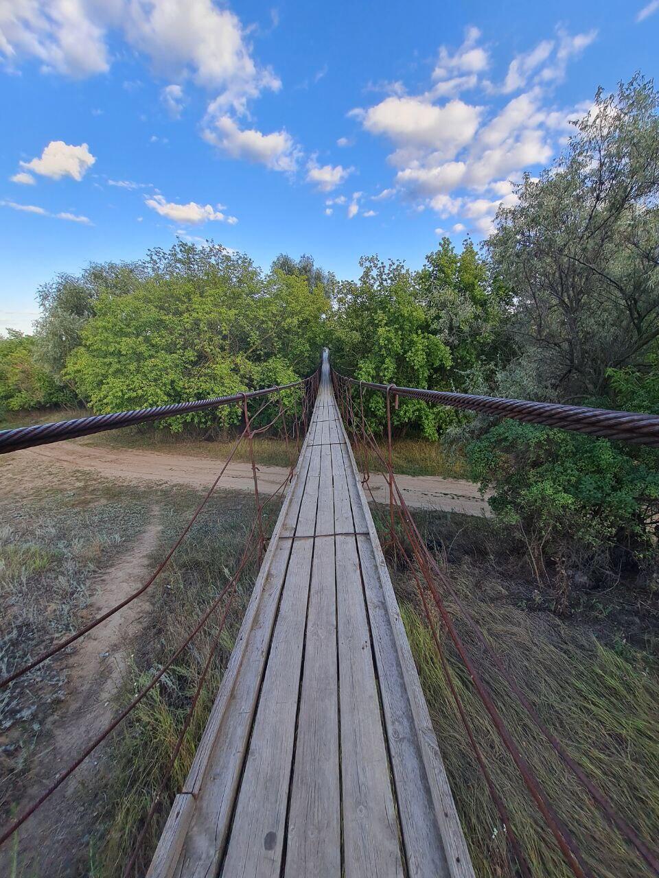 Под мостом журчит обмелевшая речка, и её тихое течение завораживает взгляд. Кажется, что время замедляется, и ты замираешь, наслаждаясь этой природной гармонией. Но вдруг мост начинает слегка раскачиваться, как будто это не твёрдая опора, а палуба корабля.