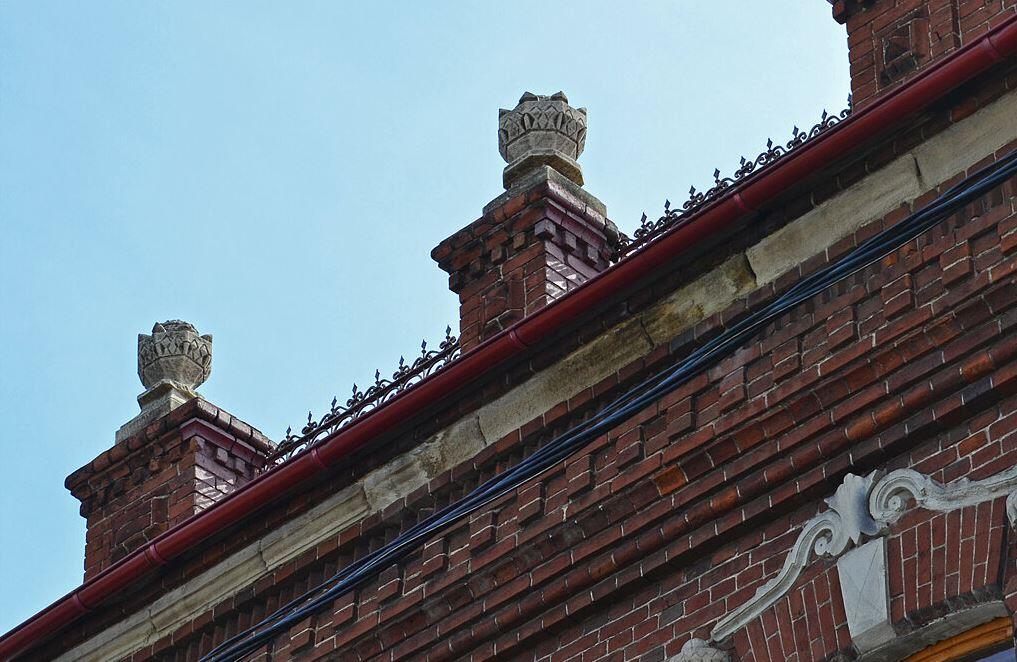 Постройка одна из крупнейших в историческом центре, обращает внимание оригинальностью кладки каждого из 3-х этажей. Терминологическую детализацию архитектурных изысков не привожу, дабы не утяжелять описание. Желающие здесь могут ознакомиться. Единственное, на что хочу обратить внимание, это наличие, переживших революцию и советскую эпоху двуглавых орлов, размещенных на аттике слева и справа от надписи "1909г". Остальное можно увидеть на фото и, конечно, при посещении вживую.