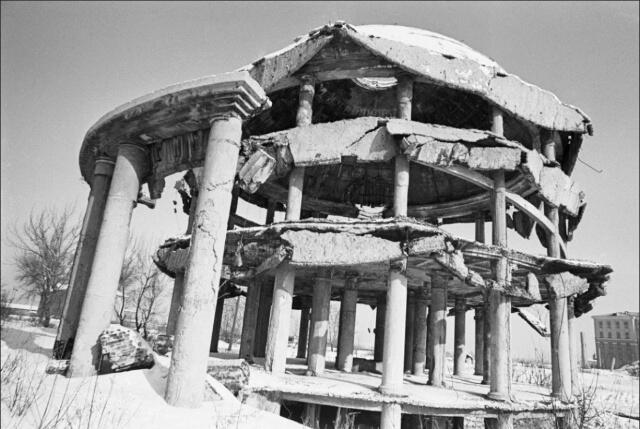 В ходе боёв здание получило значительные разрушения: одна из бомб попала прямо в купол и разорвалась между 3-м и 2-м этажами. От великолепной областной больницы остался только искореженный купол ротонды, с дырой в 2х2 метра, который чудом держался на колоннах.