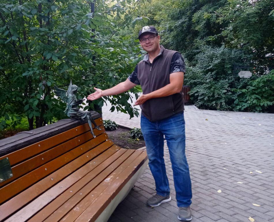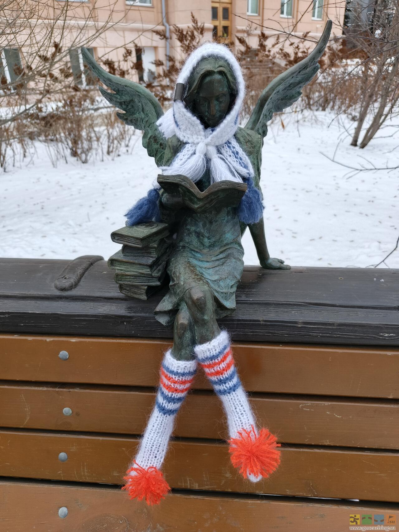 А ещё в сквере есть нечто миниатюрное и трогательное, что меня просто очаровало! Многие игроки, наверное, помнят (по тайнику) Петербургского ангела, который с зонтиком в одной руке и книгой в другой примостился на скамейке в Измайловском саду на набережной Фонтанки. Очень милый! Так вот в Литературном сквере Челябинска есть свой Читающий ангел! Он (вернее она!) тоже сидит с книжкой на спинке скамейки, которая сделана в виде книги. В интернете мне встретилось и другое название миниатюрной бронзовой скульптурки – «Окрылённая чтением». Но ангел мне нравится больше.