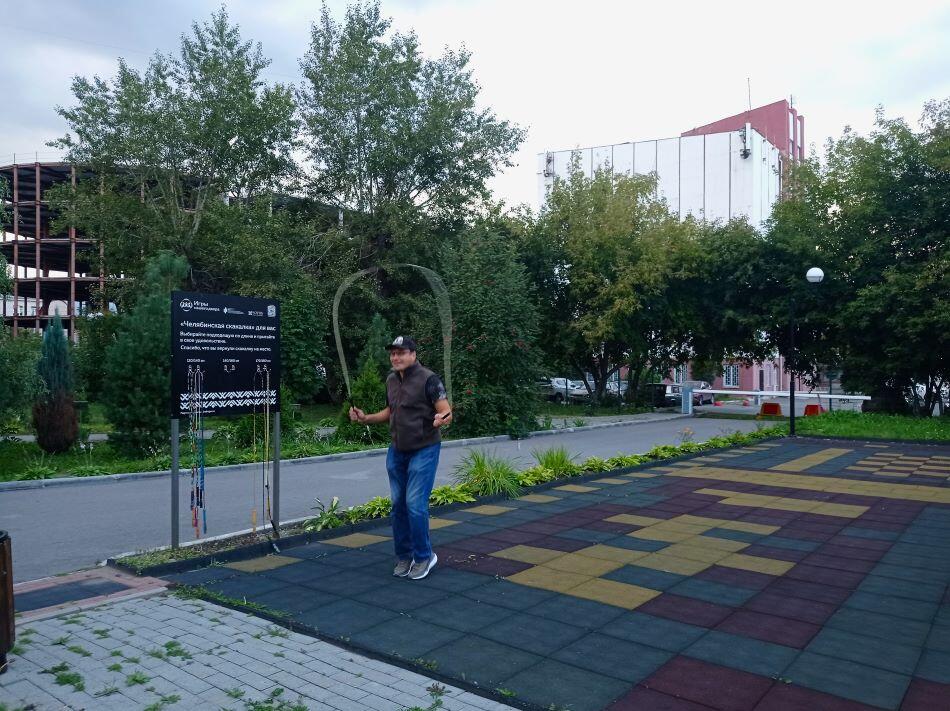 В сквере также есть большая площадка для подвижных игр и занятий спортом. Например, вы можете взять висящие на площадке скакалки-прыгалки и вволю попрыгать. Женя незамедлительно так и сделал. Прыгает он быстро и ловко! И вы попробуйте!