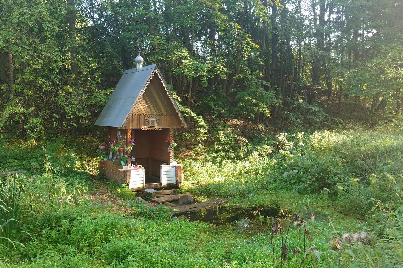 Родник у дороги в деревню Маринки. Святой источник обустроен надкладезной сенью с главкой и крестом.