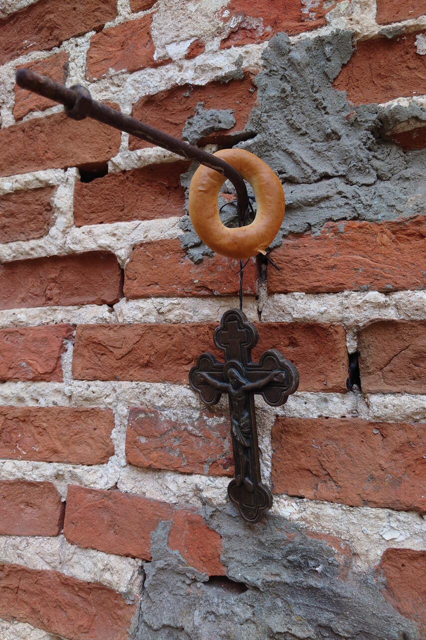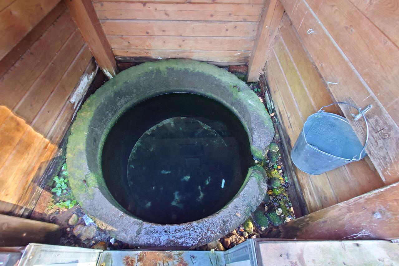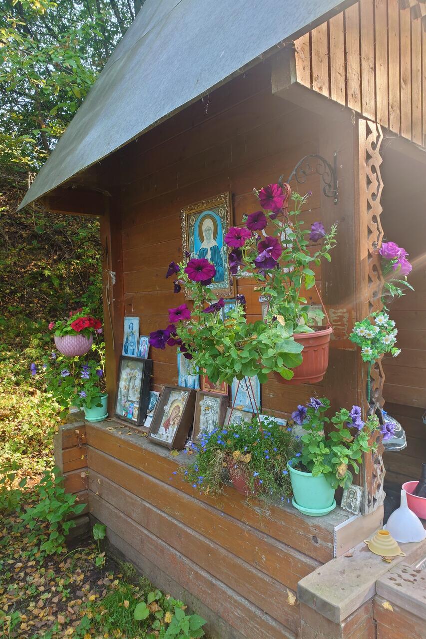 Заключён в глубокое бетонное кольцо большого диаметра с непривычно толстыми стенками, сверху построен «домик» - надкладезная сень с главкой и крестом. Летом на её стенах висят кашпо с цветами, красота) Мы полили их водичкой святой – видать, на то и расчёт делали благоукрасители, когда эти горшки с цветами вешали/ставили.