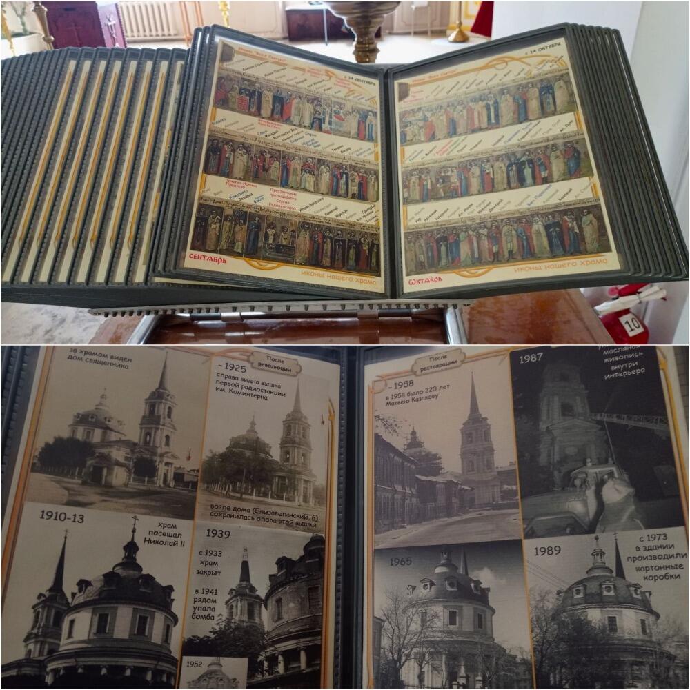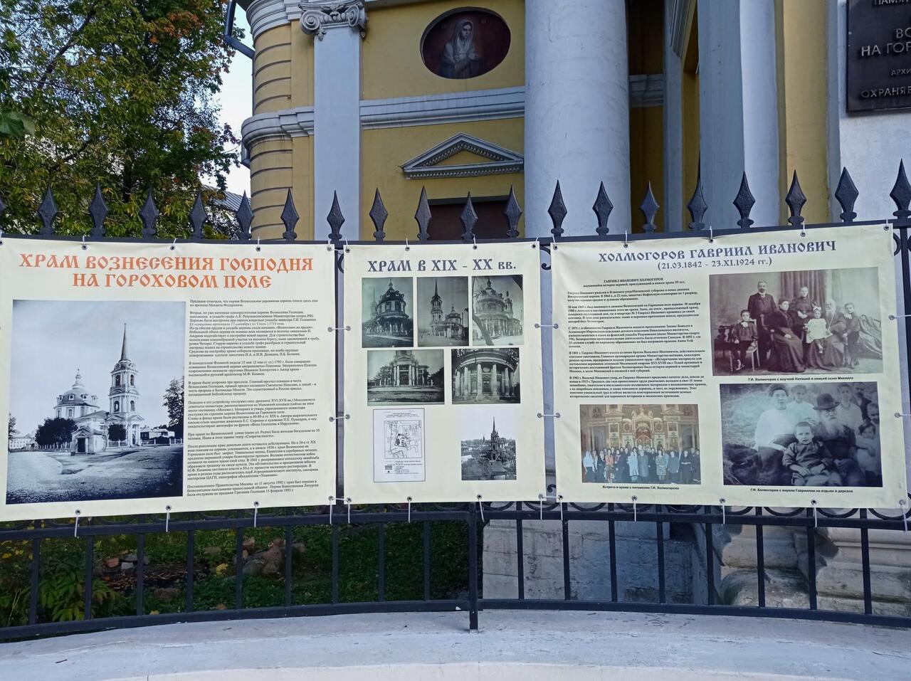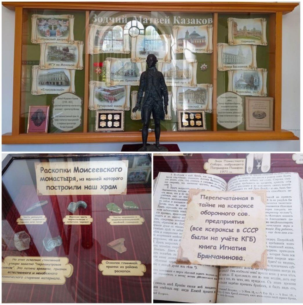 Чем ещё интересен храм Вознесения Господня на Гороховом поле? Если вы зайдёте внутрь (через колокольню), то, думаю, немного удивитесь – здесь создано нечто вроде небольшого музея. На постаменте – миниатюрная скульптура архитектора Матвея Казакова, а за ним стенд с фотографиями и описанием его основных творений в Москве и окрестностях. А в витринах – информация о Моисеевском монастыре и находки при раскопках на его месте в ходе строительства торгового центра на Манежной площади. Еще есть некоторые иллюстрации жизни христиан в Советском Союзе.