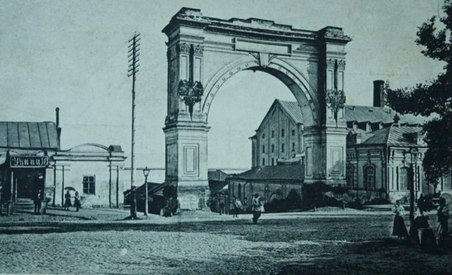В первоначальном виде арка была деревянной. Ее построили в 1863 году к визиту сына Александра II - Николая Александровича (был цесаревичем - наследником до 1865 года). В 1871 году возвели уже "царские ворота" из красного кирпича, которые позже заштукатурили и окрасили в белый цвет.