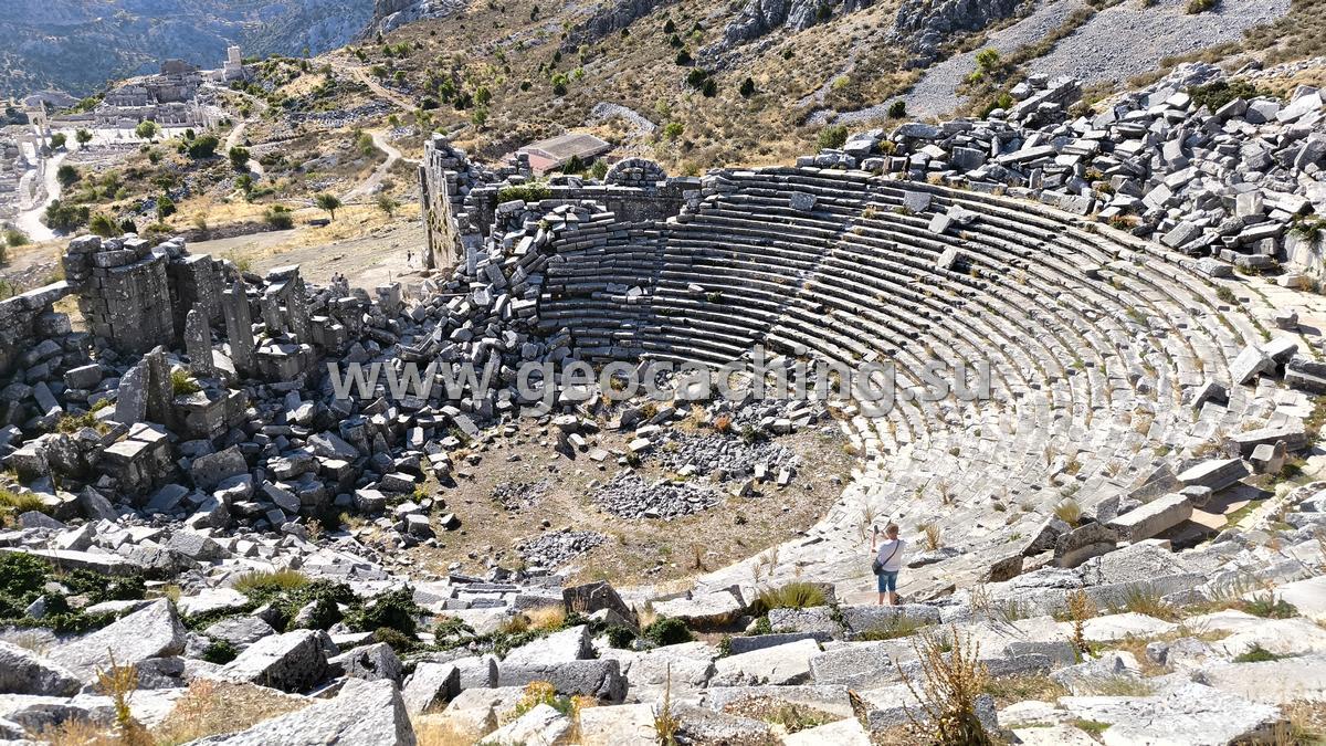 Чуть дальше и выше от библиотеки мы попадаем в театр, который рассчитан на 9000 зрителей. При том, что общее население города в период его расцвета оценивается примерно в 5000 человек. Это свидетельствует о том, что театр привлекал зрителей не только из самого Сагалассоса, но и из окрестных поселений. Театр построен в греческом стиле, а сцена была выполнена в римском стиле. Раньше здесь проходили представления и гладиаторские бои. Несмотря на то, что театр еще не отреставрирован, он не плохо сохранился, кроме того, отсюда открывается потрясающий вид на горную долину и сам город. Зрители проходили в театр к своим местам по тоннелям, вырубленным в скалах.