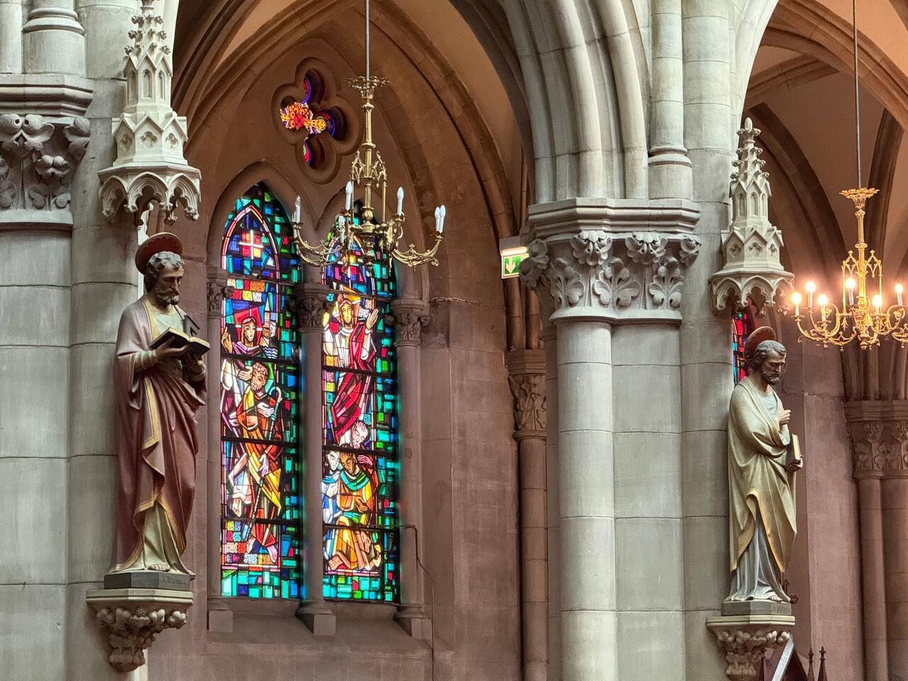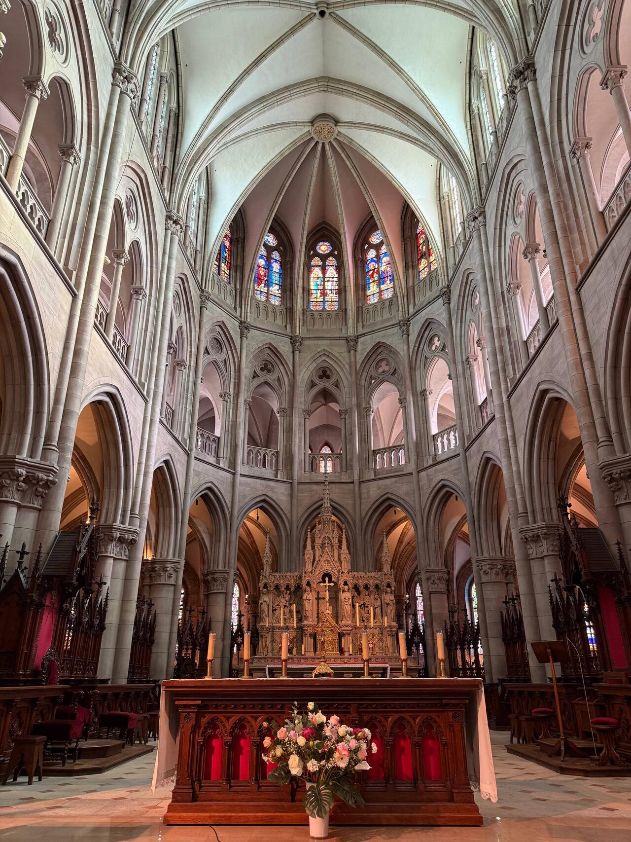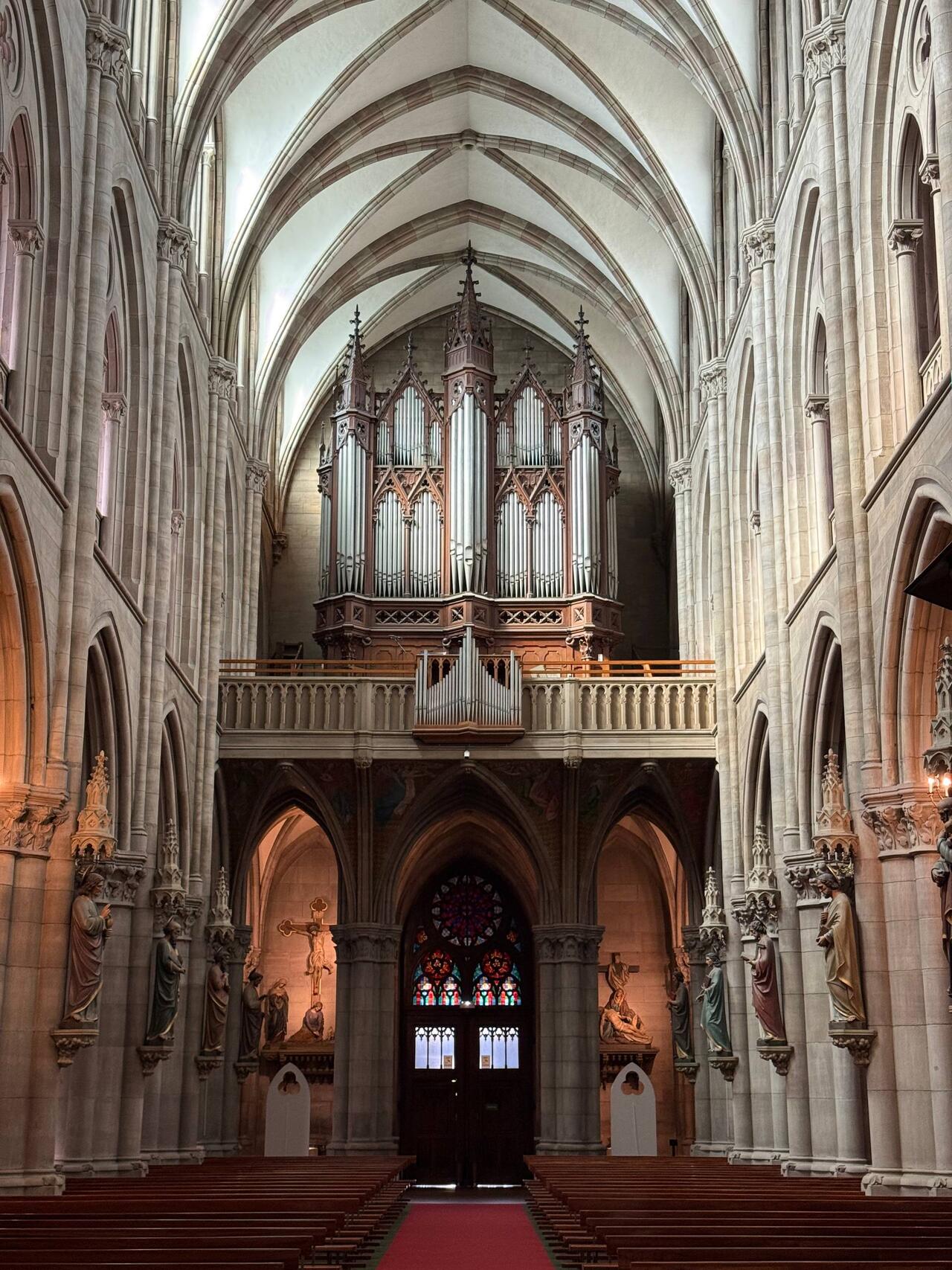 Если подойти ближе, можно заметить множество тонких деталей — каменные гаргульи, резные узоры и удивительную игру света в окнах. А вечером, когда собор подсвечивается, он превращается в настоящий сказочный замок.