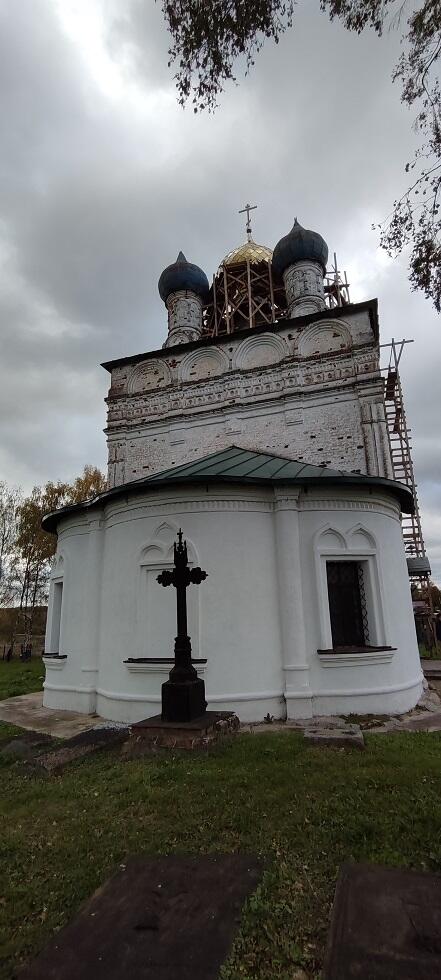 Прекрасный образец местного сельского вотчинного храма, формы которого характеризуют своеобразную манеру костромской архитектурной школы 17 в., отличающуюся ясностью конструкции и нарядностью фасадного декора. Его удачно дополняют более поздние постройки — колокольня в стиле зрелого классицизма и оставшиеся части церковной ограды с псевдоготическими башенками и эклектическими воротами. Церковь принадлежит к распространенному в 17 в. типу бесстолпных пятиглавых храмов с трехчастным алтарем и трапезной. В объемной композиции доминирует высокий двусветный четверик, несколько растянутый по оси север-юг, с тесно поставленными луковичными главами (центральная более крупная, чешуйчатая) на глухих цилиндрических шеях. У пониженного алтаря лишь с востока намечены закругления апсид (средняя значительно крупней боковых).