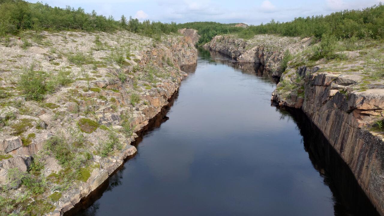 Классно было бы пройти на маленьком утлом судёнышке по всей этой реке от сказочного Ловозера до самого Баренцева моря! Классно, да. Только здесь придётся выходить на берег и обносить Плотина одной из множества сущностей Серебрянской ГЭС не даёт шансов на беспрерывность водного пути. Начинающийся от автомобильного моста и ровным каналом идущий до неё каньон получился потрясающий живописным! Да, здесь имеет место "рукоприкладство", но разве это важно, когда так красиво! Получилось весьма органично и, на наш дилетантский взгляд, не особо сильно повредило природе, ну или не повредило вообще. Говорят, в этом каньоне очень хорошо ловится рыбка всякая северная с такими ласкающими слух названиями: сёмга, сиг, хариус, кумжа, но мы не рыбаки, мы едоки =) и сами не проверяли. Нам обозрение важнее. Суровая красота и спокойная сила! Среди почти ровной тундры с её супернизкорослой растительностью вдруг раз! И такой каньон!
