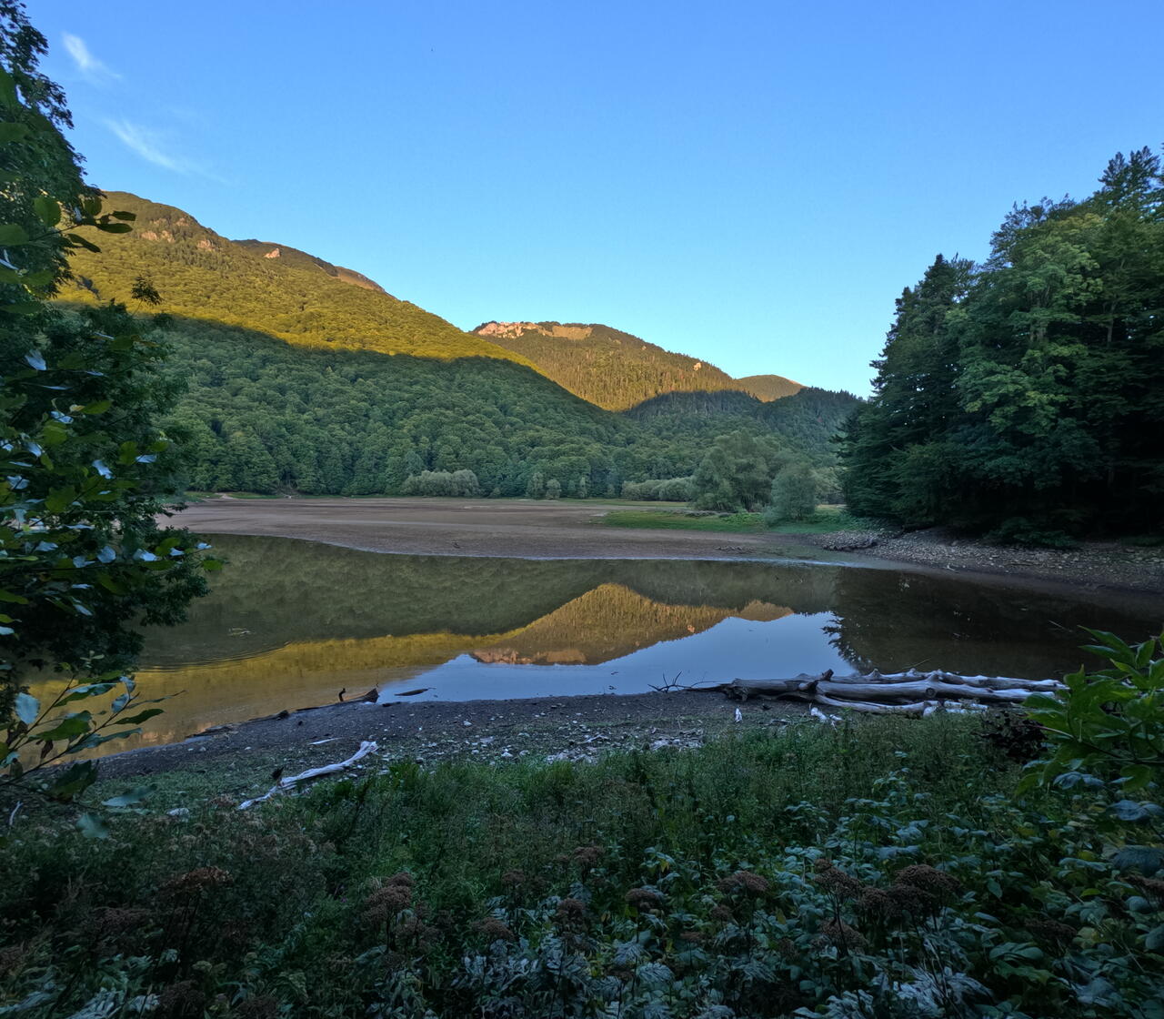 Маршрут составляет 3.5 километра, но не всегда озеро красочно. В середине лета до осенних дождей озеро подсыхает, берега обнажаются, и речка питающая озеро извивается червяком, течет по постоянному узкому руслу. Оставшаяся вода нагревается и в ней можно купаться. Вода прозрачная, хоть дно и глинистое.