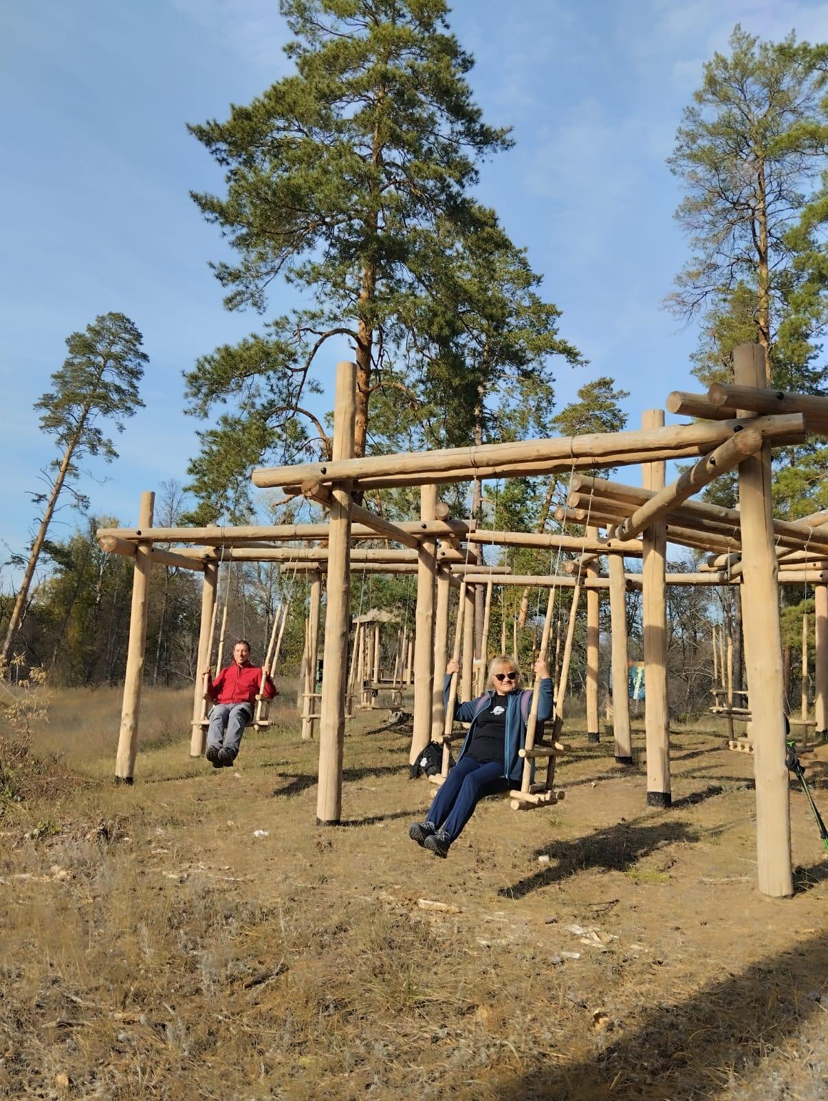 Экотропа, конечно, рассчитана на маленьких посетителей. В одном месте их ждет большое количество деревянных качелей.