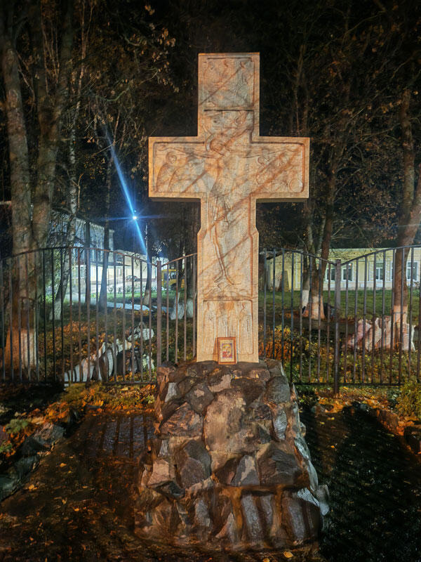 Поклонный крест установлен на месте разрушенного здания Покровского собора в память о жизни св. Луки (Войно-Ясенецкого) в Фатеже и Любаже (1905-1908 гг.). Архиепиископ Лука - епископ Русской православной церкви, российский и советский хирург, учёный, автор трудов по анестезиологии и гнойной хирургии, доктор медицинских наук, профессор; и духовный писатель был жертвой репрессий и провёл в ссылке в общей сложности 11 лет. Реабилитирован в апреле 2000 года. Украинская православная церковь причислила архиепископа Луку к лику святых 22 ноября 1995 года. В августе 2000 года канонизирован Русской православной церковью в сонме новомучеников и исповедников Российских для общецерковного почитания