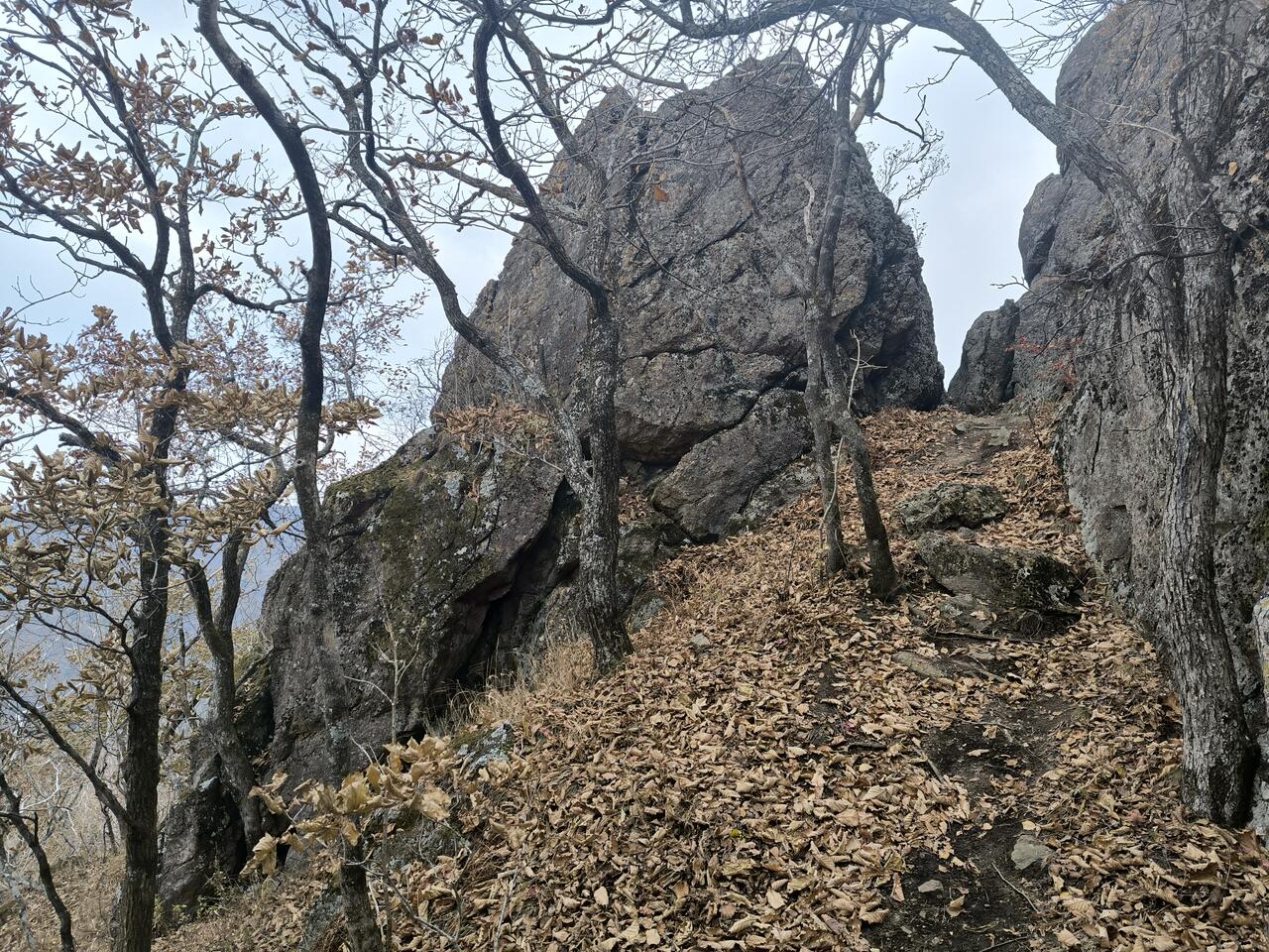 Дальше тропа идёт по Океанскому хребту. Слева появляется прекрасный вид на Уссурийский залив и бухту Лазурную, ну а справа – бескрайние холмы, между которыми спряталось городское водохранилище. Через несколько сотен метров появляется ещё один небольшой, но коварный подъём. Коварность его заключается в сыпучих камнях, которые то и дело пытаются утянуть вниз. Здесь легко упасть на пятую точку и скатиться вниз (особенно на обратном пути).
