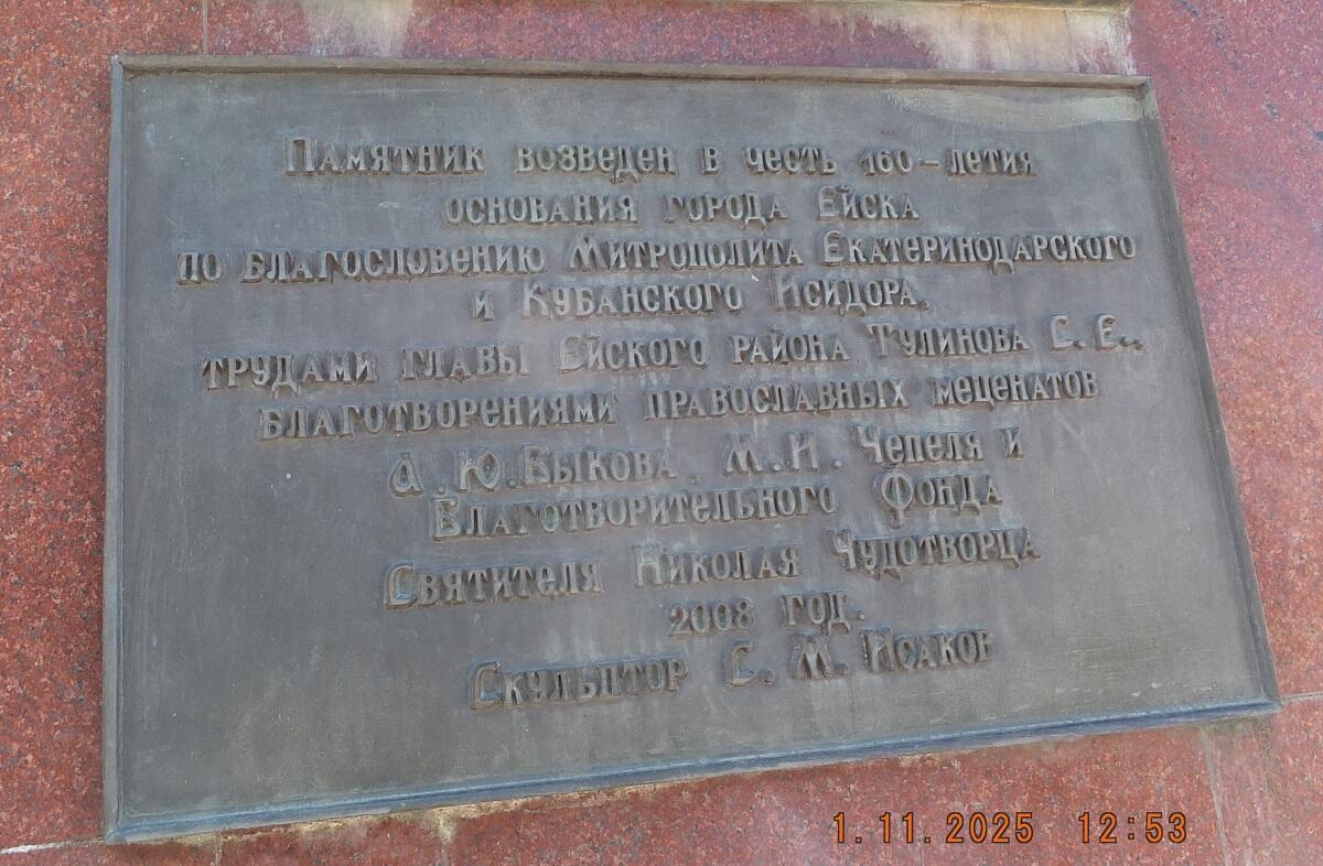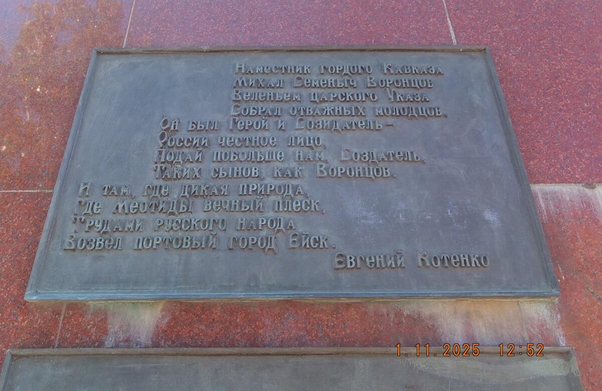 Удивительно, но в 2008 году, теперь уже к 160 годовщине Ейска, в двух минутах ходьбы от вокзала, появился новый памятник Воронцову. В этом случае он представляет фигуру военачальника в полный рост, сидящую на коне и одетую в парадный мундир. В руке основателя города — герб Ейска, а по углам постамента, облицованного плиткой из красного гранита, расположены две пушки времен Отечественной войны 1812 года. Высота архитектурного объекта составляет 5 метров, детали отливали на подмосковном заводе по проекту скульптора Сергея Исакова.