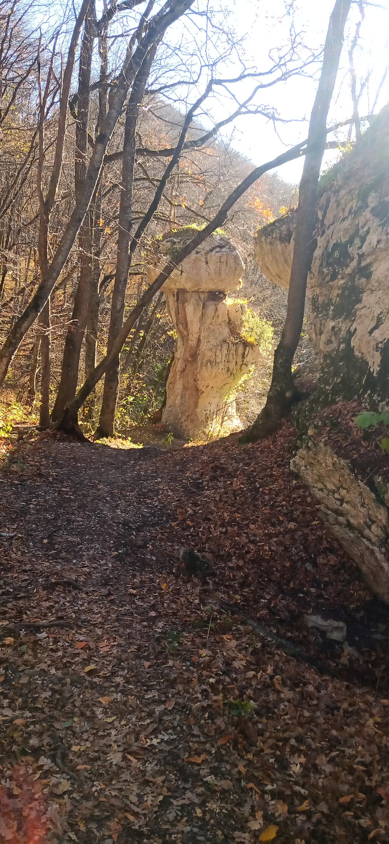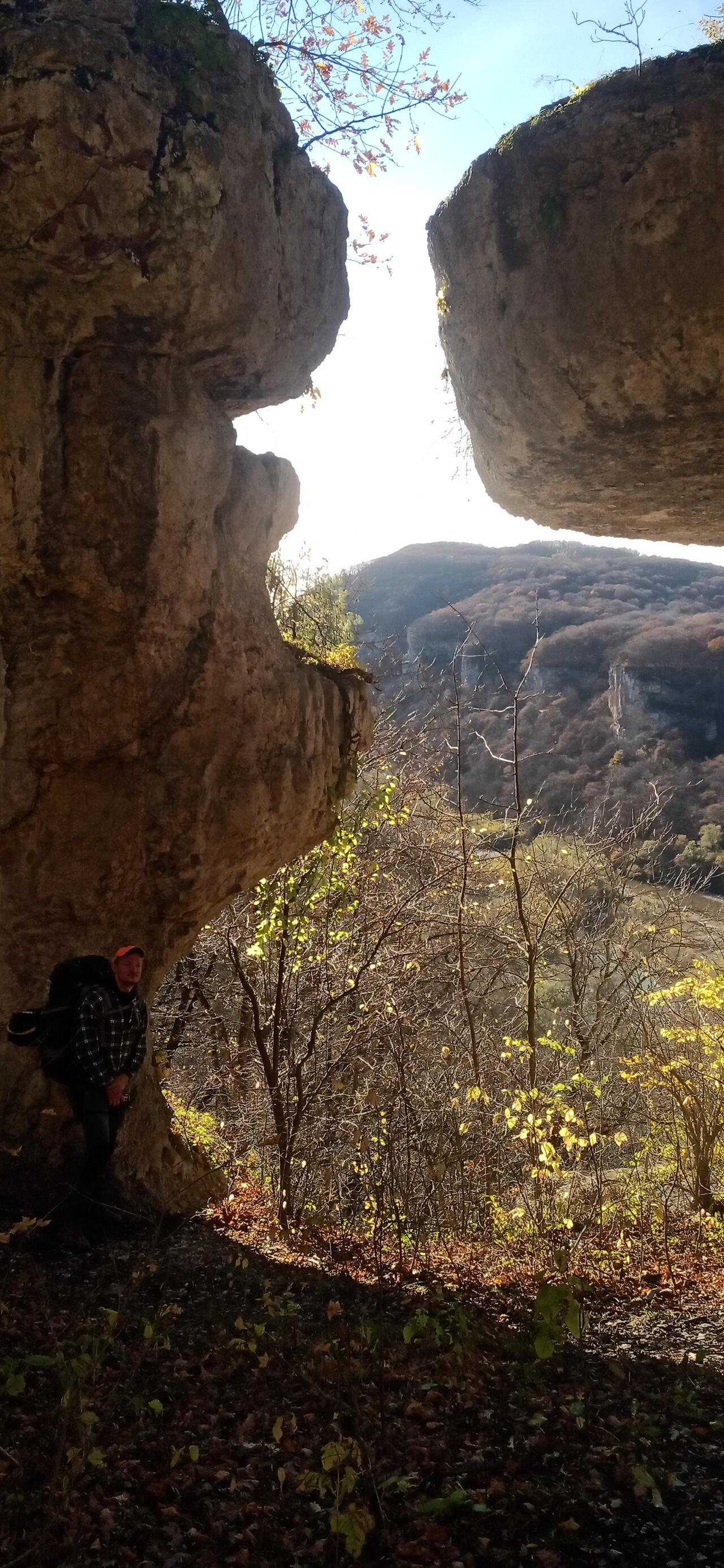 Сквозной грот, который нам приглянулся, похож на Окна Ильича. Понятно, что одна структура породы и условия выветривания. Хотя о чем это я. Это же окошки для подглядывания богами за людишками. Рядом еще растет окаменевший гриб. Играя ракурсами, можно сделать неплохие фотографии с грибом, гротом и видами на долину. Можно и себя включить в список. Тропа вдоль Урупа замечательна и полна красивых локаций и артефактов. Поэтому не исключаю вероятности появления новых тайников. Всем удачи, хороших походов и оптимистичного настроения.