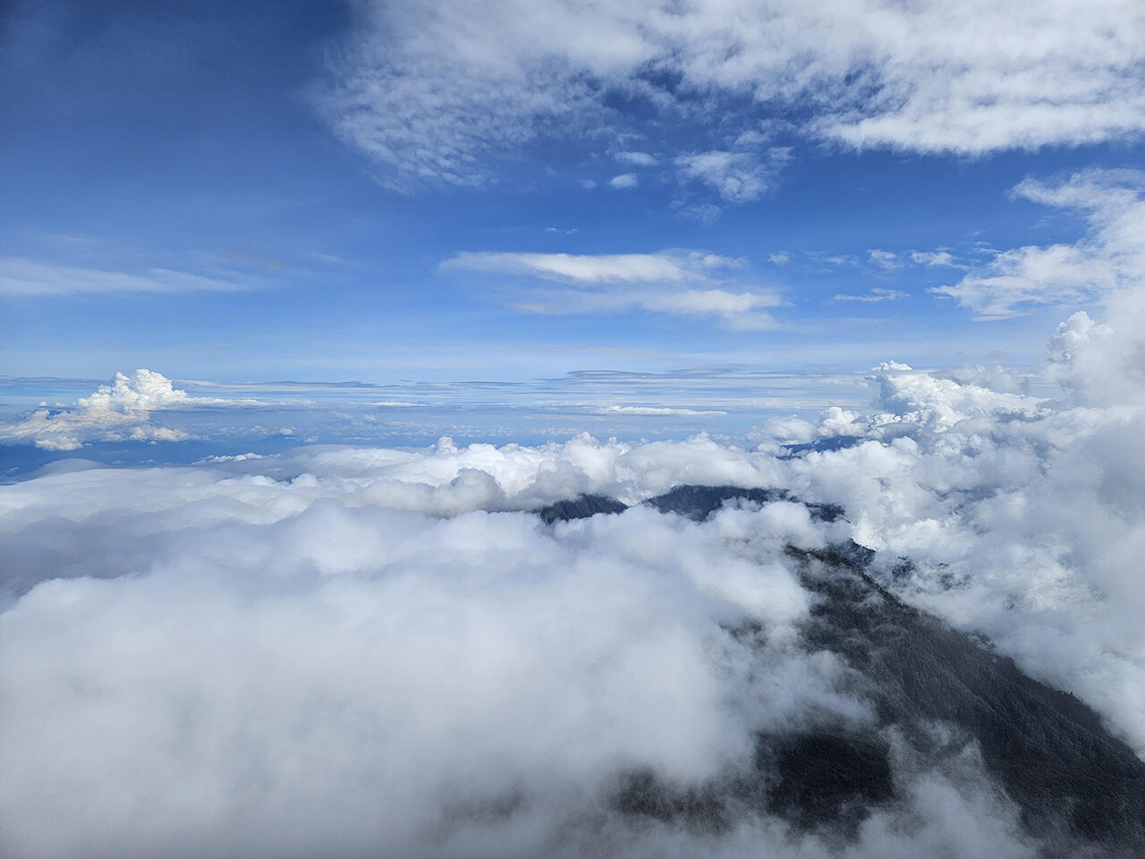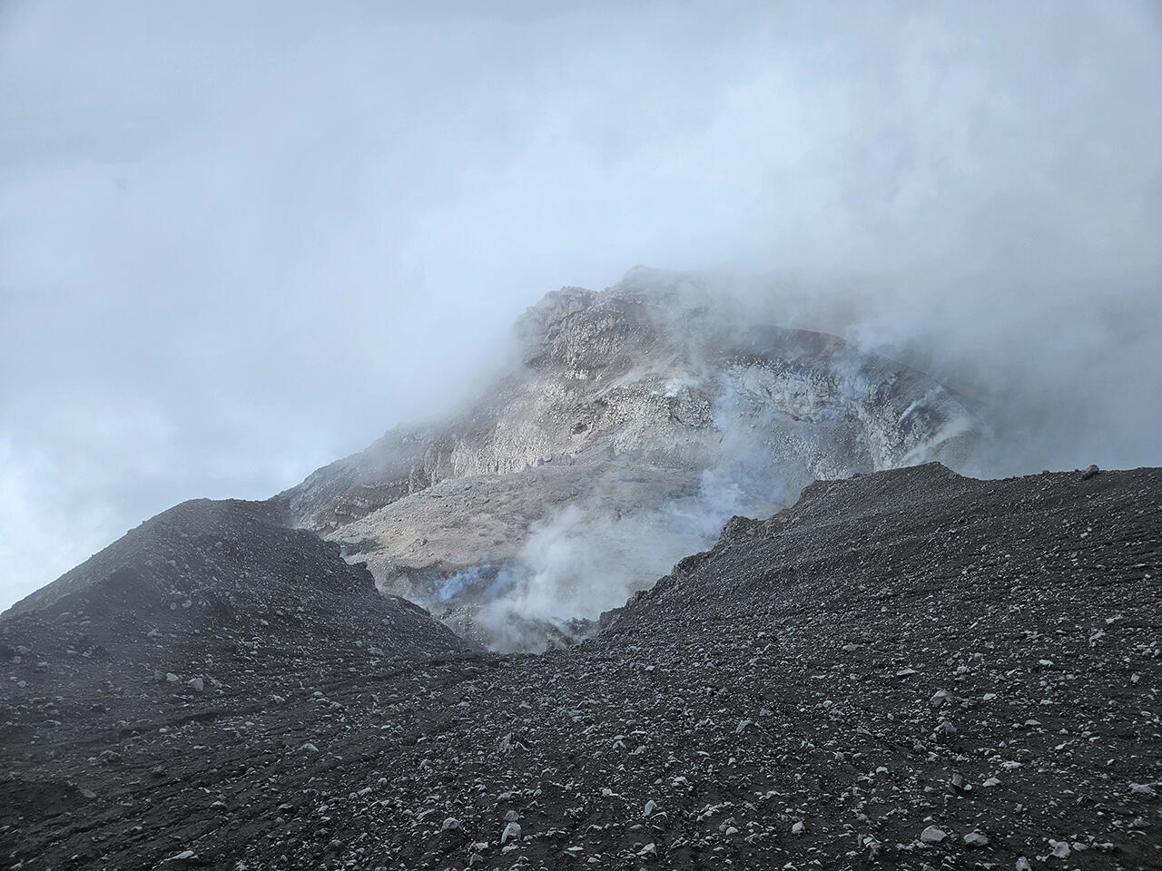 Если при взгляде на Семеру со стороны снизу ожидаешь на вершине увидеть классическую окружность с кратером по центру, то в действительности всё совсем не так. Обширная вершина Семеру имеет довольно затейливую форму, а активный кратер находится под её юго-восточным краем (с течением веков он медленно смещался с северо-запада на юго-восток). К сожалению, одновременно с моим подъёмом на вершину она стала затягиваться облаками и тучами, так что виды были открыты совсем недолго. Но я успел дойти до кромки кратера (S08° 06.639' E112° 55.538') и заглянуть вниз, пока его не затянуло окончательно. Время от времени там раздавался очередной жуткий гулкий взрыв, и в небо поднималось облако пепла, а потом с тихим шорохом этот пепел сыпался на меня. На этом месте, кстати, ловится мобильный интернет, и я «позависал» на вершине какое-то время в надежде дождаться разъяснения/улучшения погоды, но улучшения в этот (и в последующий) день так и не последовало; наоборот, начался дождик.