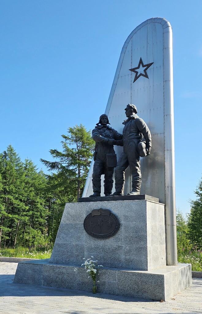 Он установлен в день 75-летия Победы в 2020 году около здания старого аэровокзала. Выбор его месторасположения обусловлен тем, что старый аэропорт Магадана играл ключевую роль в материальном обеспечении воздушной трассы Аляска-Сибирь. Через него происходила перевалка грузов из морского порта Магадана.