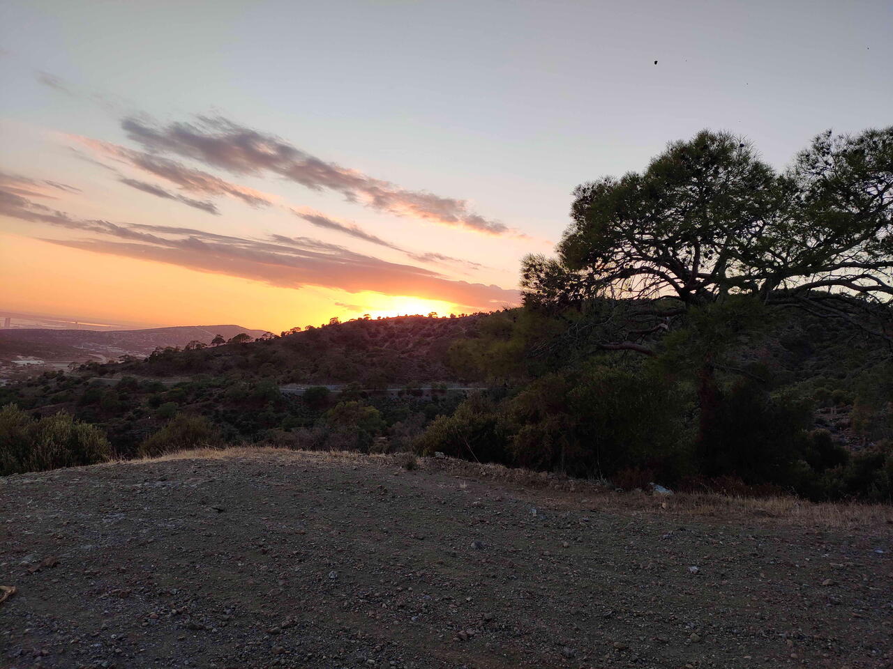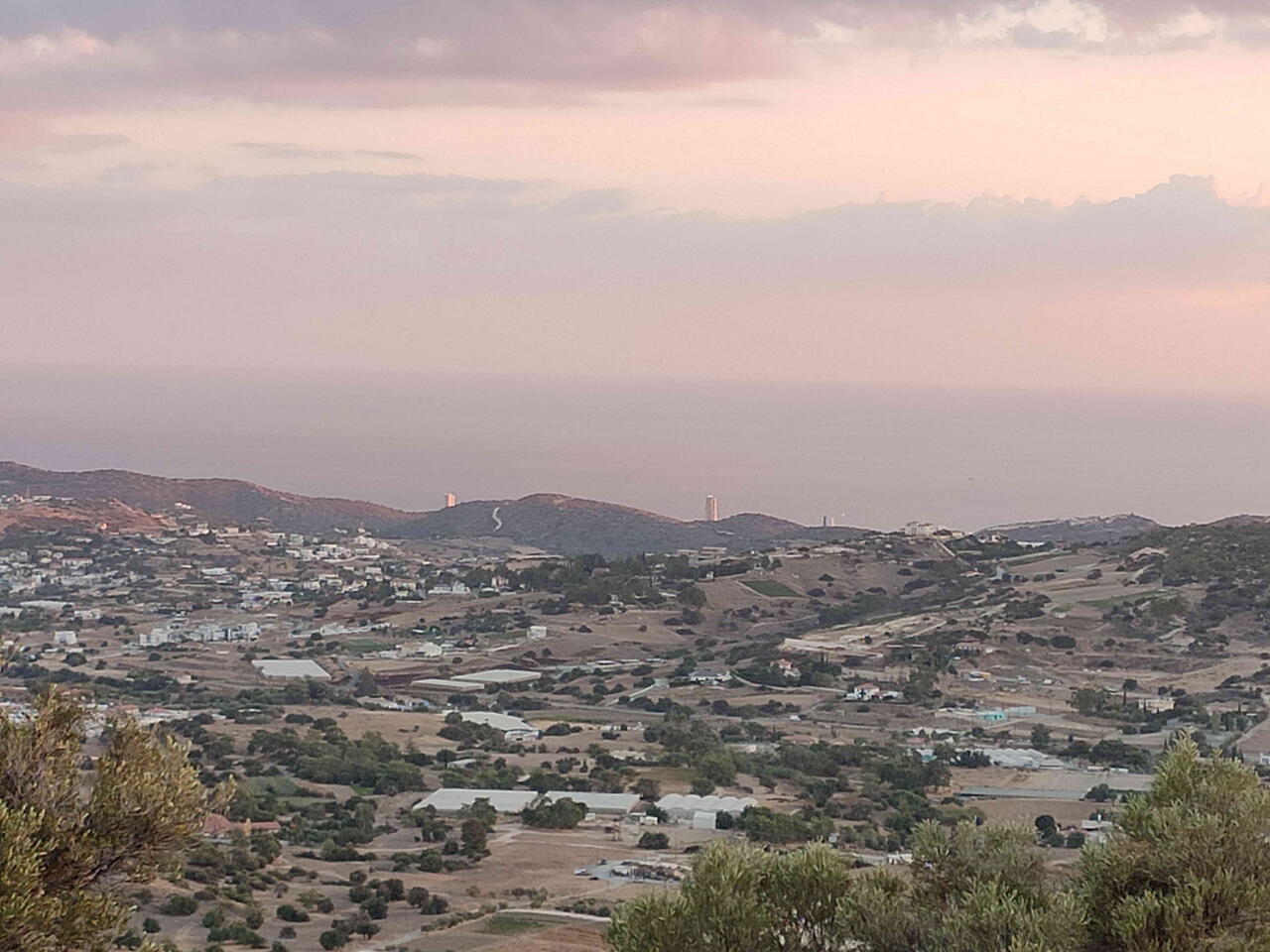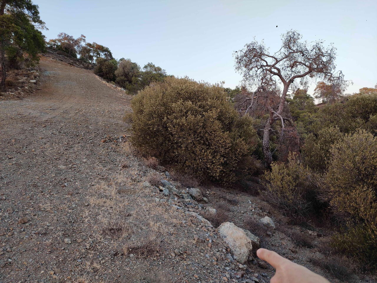 Тропа поднимается постепенно. Она петляет между валунами, и иногда надо обойти низкие кусты, пахнущие смолой. Но подъём несложный — идёшь и словно смотришь, как открывается занавес: сначала виднеется дамба Гермасойи, потом становится видно Лимассол, а дальше — и вся дуга побережья, отсвечивающая серебром.