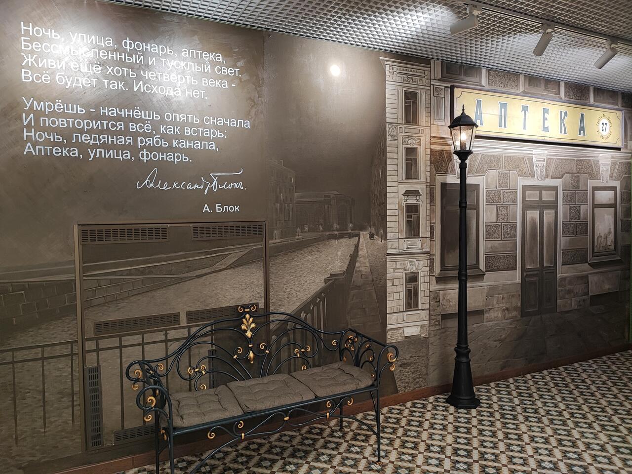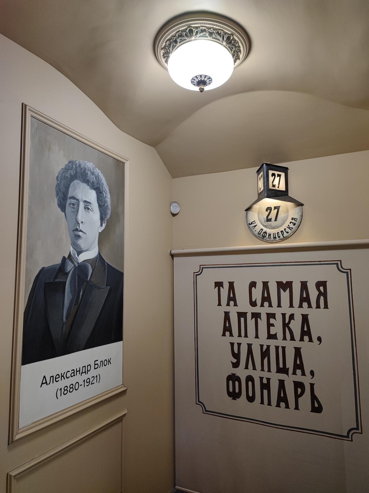 В 1907 году на первом этаже дома по адресу Офицерская улица (ныне Декабристов) дом 27 фармацевт Яков Мандельштам открыл Ново-Мариинскую аптеку. В 1912 году Блок написал своё знаменитое стихотворение «Ночь, улица, фонарь, аптека…». Поэт жил неподалёку, на Офицерской улице 57. Есть много версий, какую же аптеку описывает поэт, и некоторые исследователи склоняются в пользу той, в которой вы сейчас находитесь.