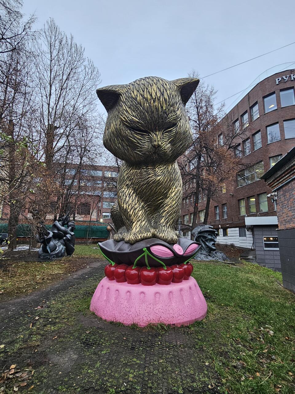 Но недавно на площадке среди этих непонятных творений поселилась милота: котик на вишнёвой подушке.