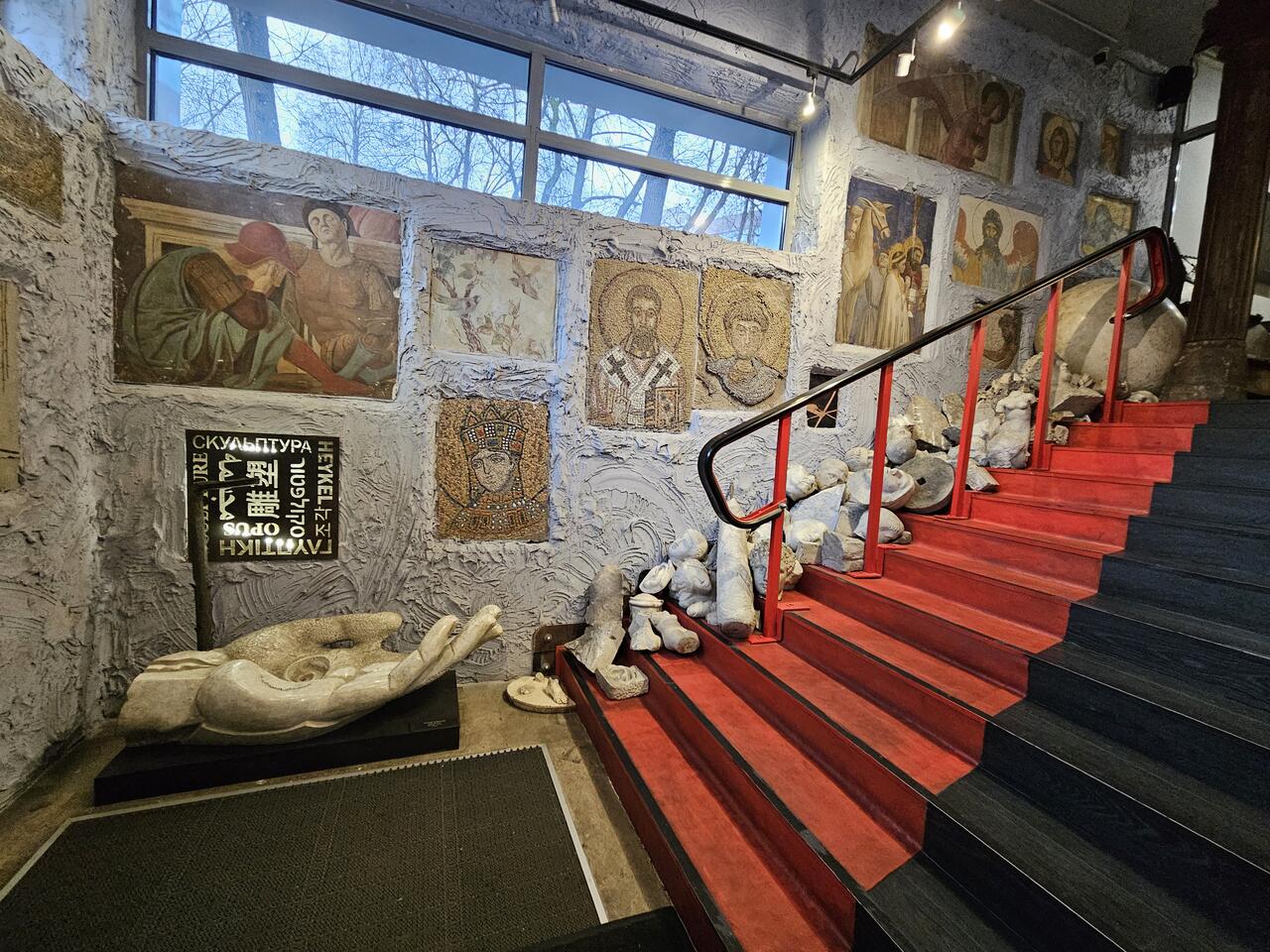 Несмотря на грозные объявления у входной двери, зайти туда можно свободно. И всё (или почти всё) посмотреть и пофотографировать тоже вполне можно. А фотографировать в Рукаве хочется постоянно. Переступив его порог вы отказываетесь в этаком музее, где выставлены работы всех Рукавишниковых: самого Александра, его отца и сына. Сразу у входа - этакая доска объявлений с анонсами различных мероприятий: концертов, занятии по лепке и рисованию для взрослых и детей… У лестницы в зал - целый водопад из фрагментов скульптур, на стенах - мозаичные картины, фрески. Уже становится любопытно. А дальше - скульптуры. Много скульптур. Они тут везде. И странные, и милые, и завораживающие - разные. Все они размещаются в нескольких залах на втором этаже. А чтобы попасть в само кафе (скорее - ресторан), надо спуститься вниз. Хотите - по лестнице, хотите - по горке-трубе. Этот второй способ улыбнул и напомнил булгаковский бал Воланда. То, как гости на него "входили". Говорят, дети именно так в ресторанный зал предпочитают спускаться. Да и я, если бы собиралась там поесть, скорее всего, этот же необычный способ спуска выбрала бы :)