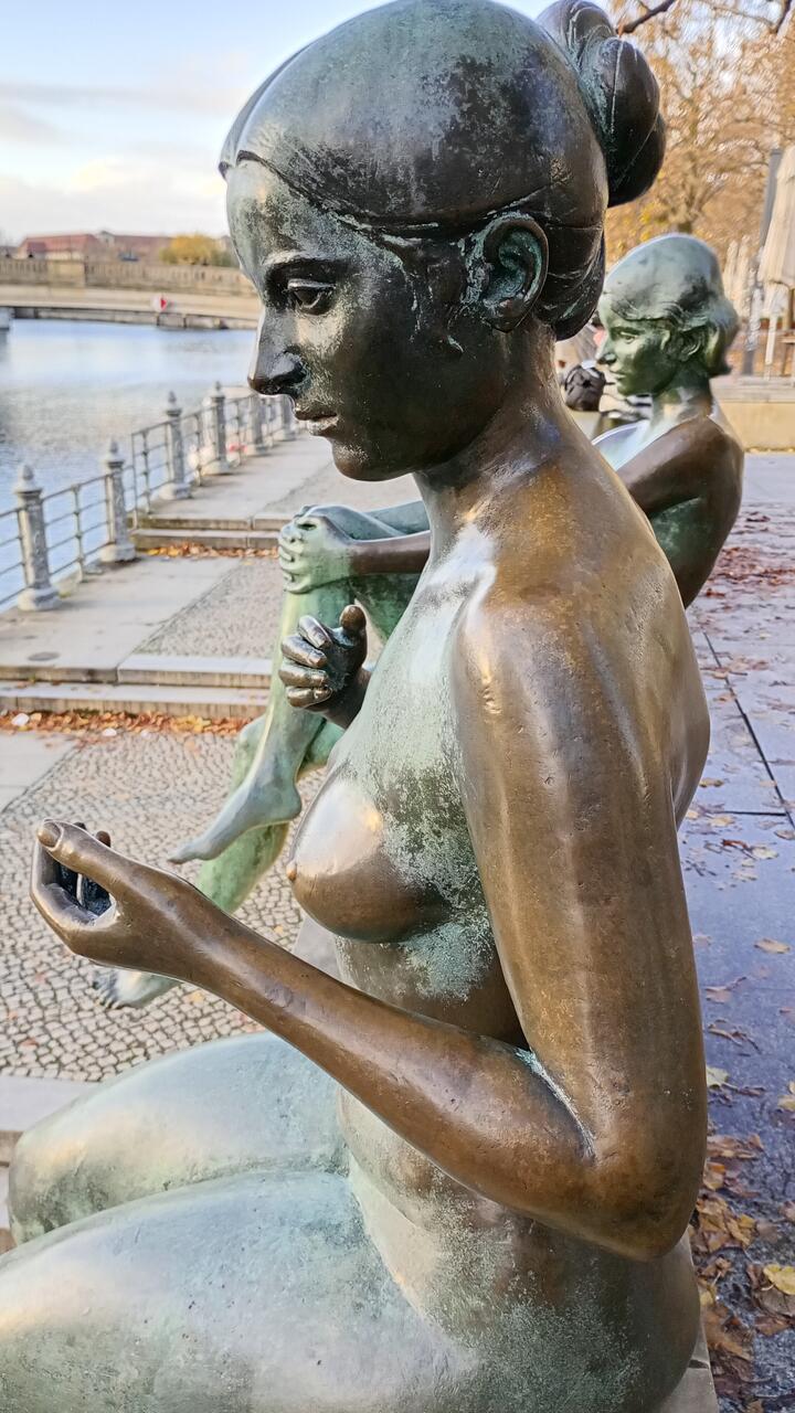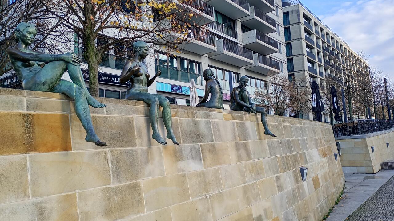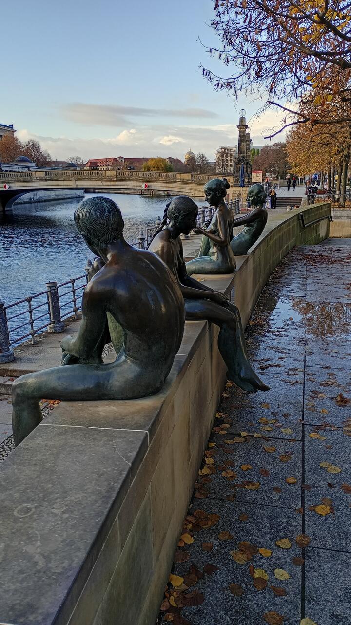 В 2001 году, после объединения Германии, отель Palasthotel был снесён из-за загрязнения асбестом, а четыре скульптуры были временно сохранены. Когда отель был перестроен в 2003 году (теперь он входит в группу Radisson), фонтан и скульптуры «Три девочки и мальчик» не вернулись на свои места. Вместо этого в 2007 году все четыре скульптуры были перенесены на своё нынешнее место на восточном берегу реки Шпрее.