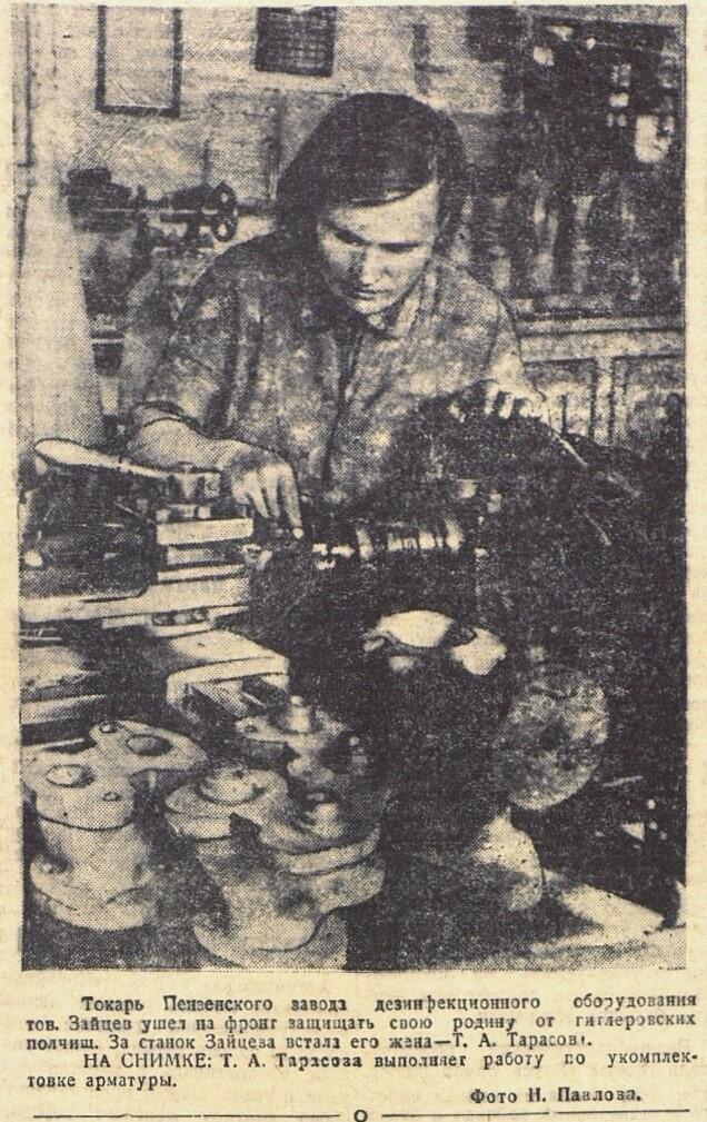Многие женщины заменили на производстве своих мужей, ушедших на фронт. В 1941 году газета «Сталинское знамя» писала о работнице завода "ДХО" Татьяне Тарасовой (см. фото), которая встала к станку вместо мужа. Женщина писала супругу на фронт: "Откровенно скажу тебе, что и страшно, и трудно было в первое время. Ведь не шутка — работать на токарном станке... На помощь мне пришли опытные товарищи. Теперь могу сказать, что с работой справляюсь неплохо — полторы-две нормы за смену. Я счастлива тем, что именно я, твоя жена, заменила тебя на заводе".