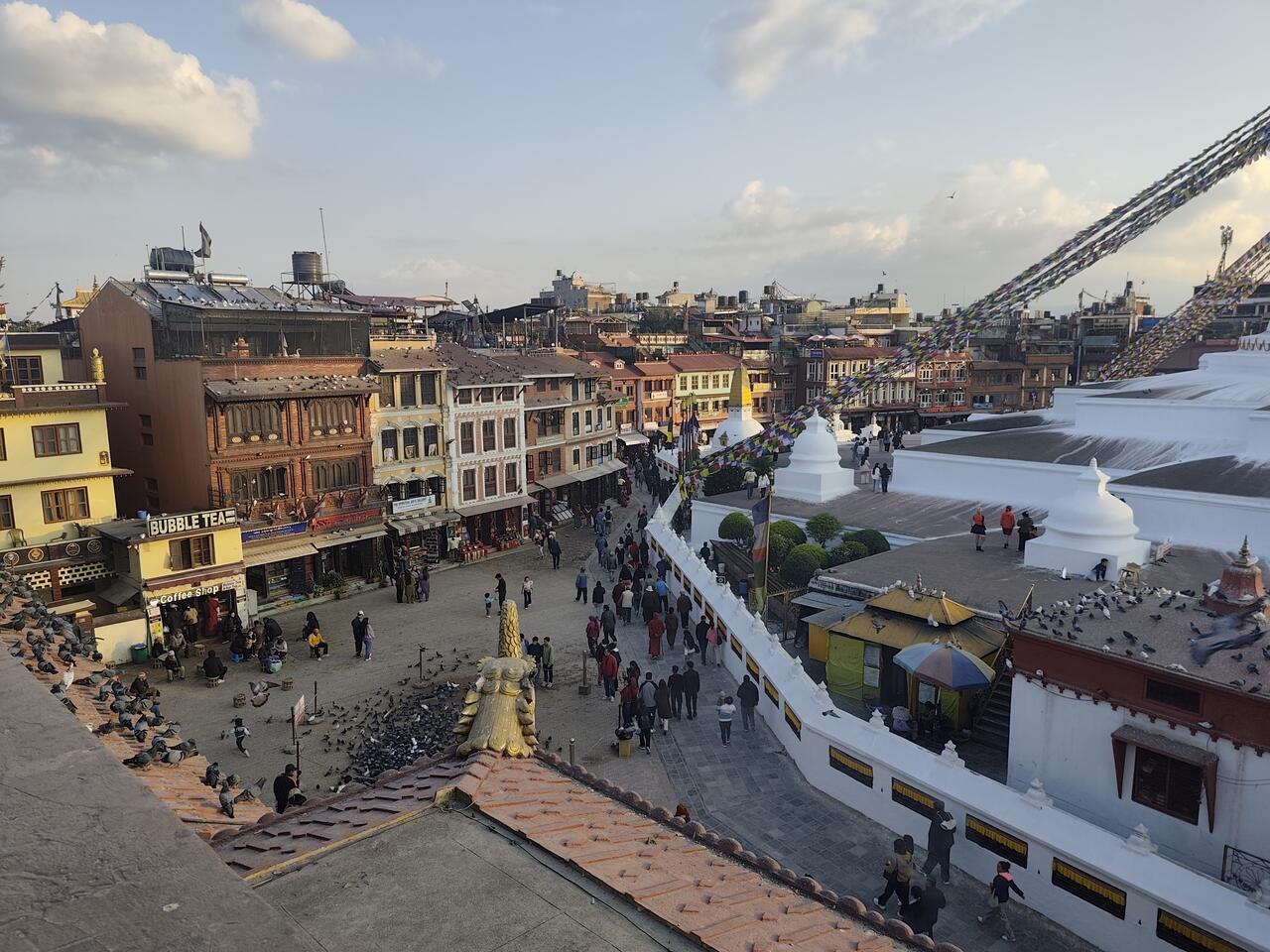 Другая историческая версия относит постройку ступы к V веку, во времена правления раджи Мандевы из династии Личчхави. Согласно этой теории, святилище было возведено в период тяжелой засухи, когда население искало духовной опоры и надежды на спасение от неурожая. Независимо от истинности той или иной версии, очевидно, что ступа с момента своего основания являлась местом особой духовной силы и притяжения для верующих.Территория вокруг ступы также представляет большой интерес для путешественников. Здесь расположено множество тибетских монастырей разных школ и направлений, в некоторые из них можно зайти. Площадь окружена трёх- и четырёхэтажными зданиями, в которых кипит жизнь: работают многочисленные сувенирные лавки и магазины. В них можно найти всё — от традиционных тибетских украшений, поющих чаш и благовоний до изделий ручной работы и ритуальных предметов. Это отличное место для покупки аутентичных сувениров. На крышах многих домов располагается уютные кафе, с которых открывается великолепный вид, а ступа представляет собой целый мир, живущий в своём особом ритме.