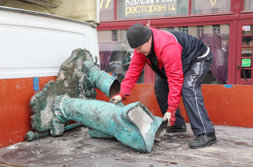 Постояв на улице немногим больше месяца, скульптуры начали зеленеть, а потом и ржаветь. Потом «Сапоги» лишились одной шпоры, а у «Подписи» вандалы отломили половину подсвечника. Осмотрев экспонаты, чиновники признали, что при изготовлении объектов нарушена технология. Сразу после новогодних каникул обе скульптуры демонтировали и вернули автору на исправление ошибок. Добавим, что во время демонтажа один сапог сломался пополам… В мэрии обещают вернуть памятники на прежнее место в ближайшие недели. А горожане горячо надеются, что этого не произойдет.