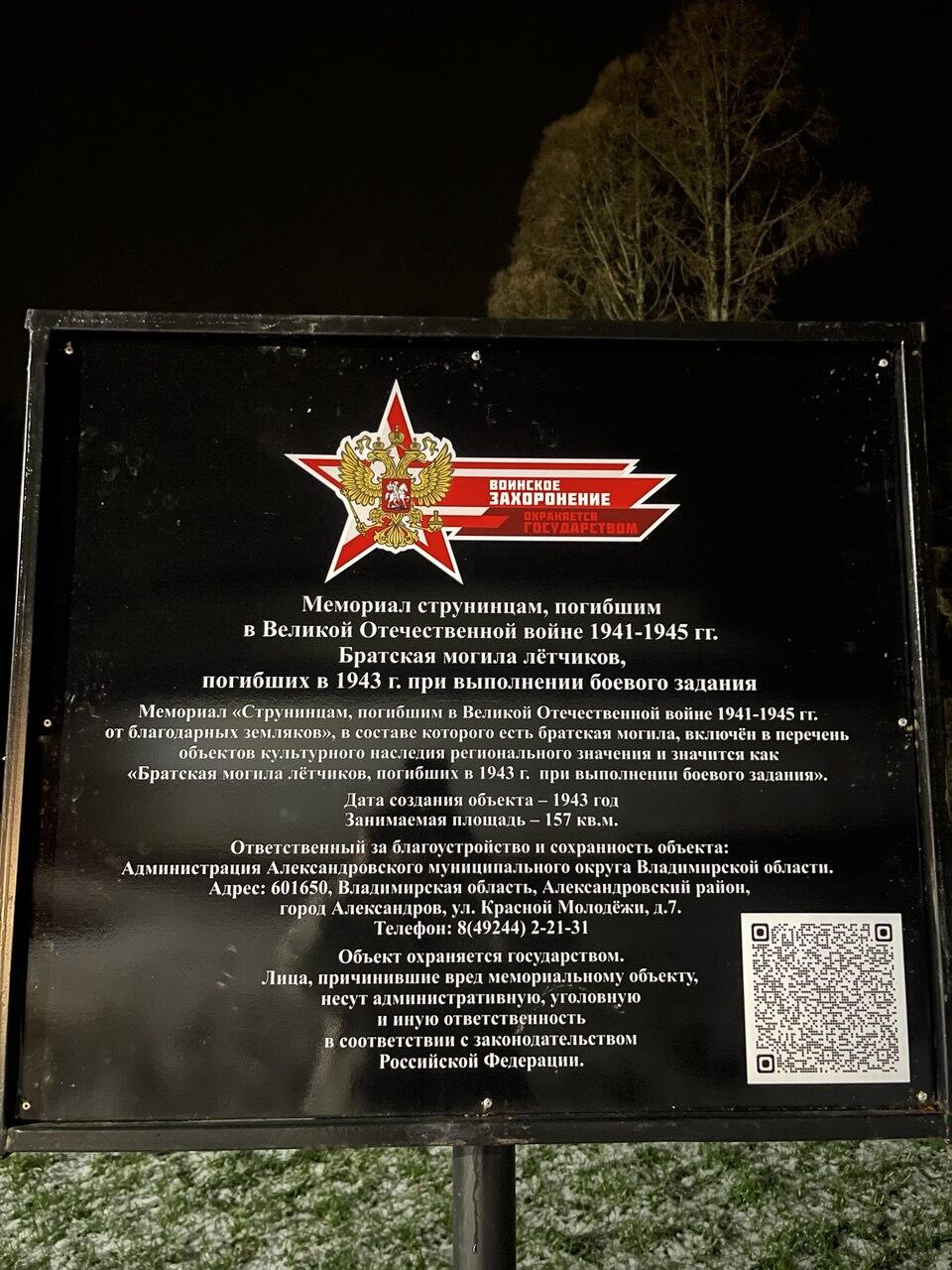 До 2015 года воинское захоронение погибших членов экипажа и пассажиров самолёта Ли-2 было утеряно. Благодаря совместной работе поискового отряда «Небо Родины» (г. Владимир) и администрации города Струнино около года проводились активные поиски места братской могилы погибших в катастрофе военнослужащих, были сделаны запросы в районные и областные архивы, Центральный архив Министерства обороны и Российский государственный архив экономики, произведён поиск очевидцев в городе Струнино. В результате проведённых мероприятий было установлено, что погребение тел погибших военнослужащих было произведено не на самом кладбище, а недалеко от входа на него. В настоящее время рядом с могилой находится памятник погибшим в годы Великой Отечественной войны землякам. 9 мая 2016 года на могиле торжественно был открыт памятник и увековечены члены экипажа и пассажиры сгоревшего Ли-2, воинское захоронение было взято на учёт администрации города Струнино.
