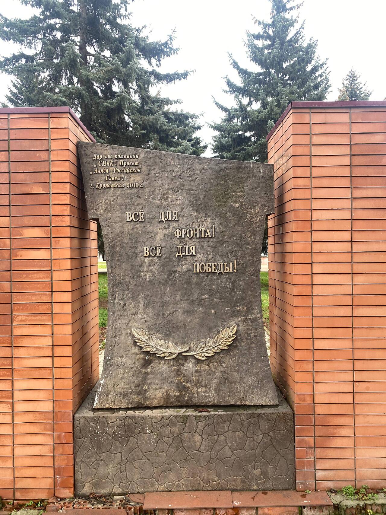 - Памятный знак труженикам тыла в годы войны — город Кропоткин.