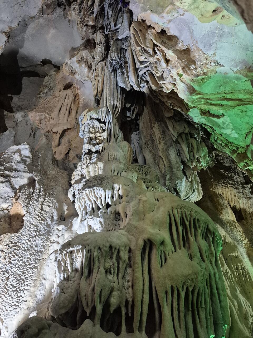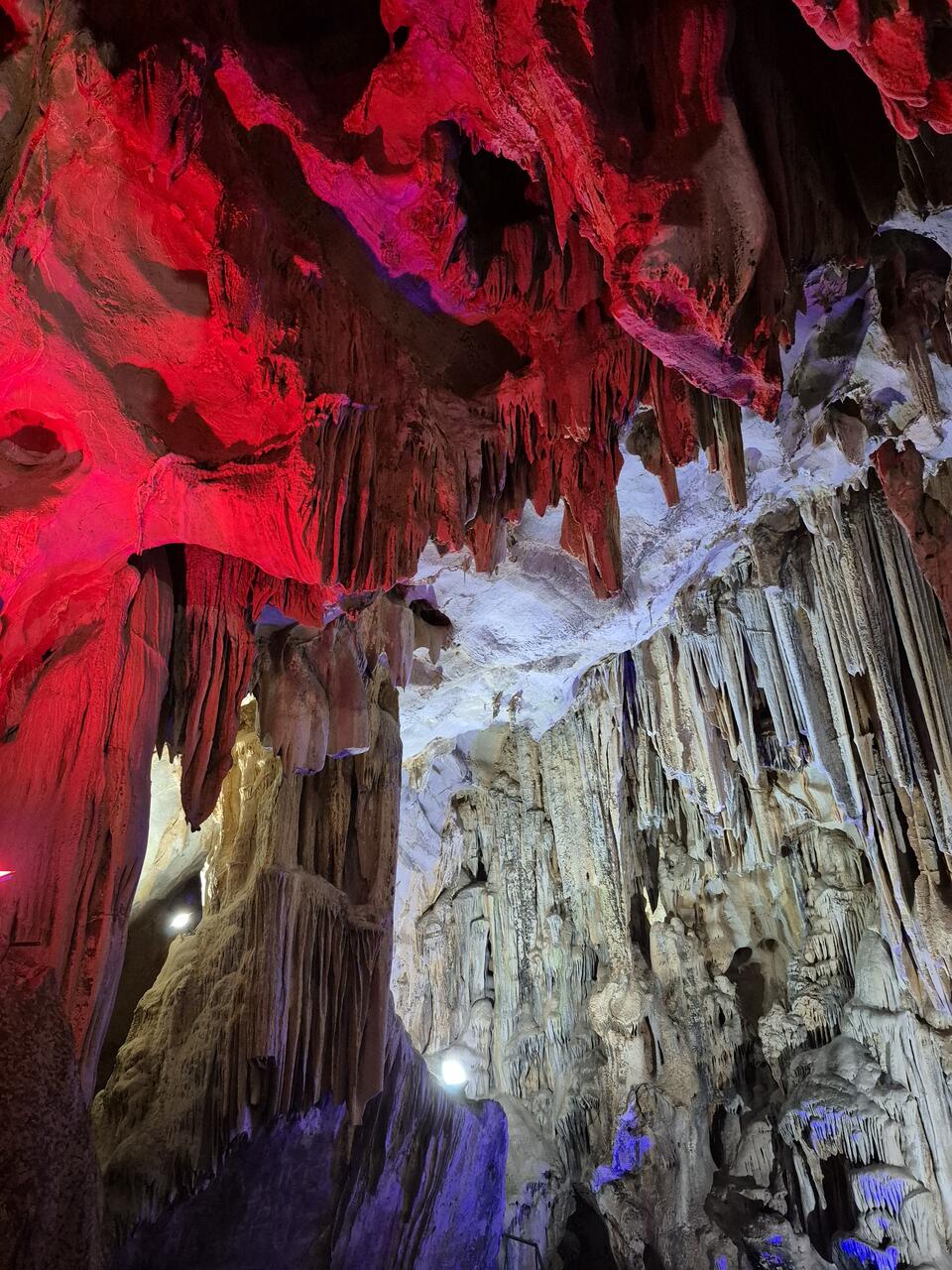 Внутри пещеры можно увидеть сталактиты и сталагмиты, переливающиеся разными цветами: красным, желтым, синим и зеленым. По этой причине, ее второе название — Радужная пещера.