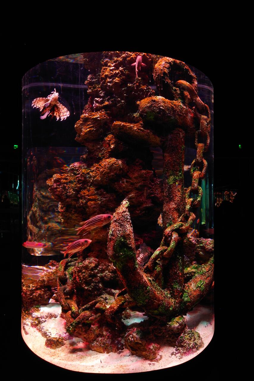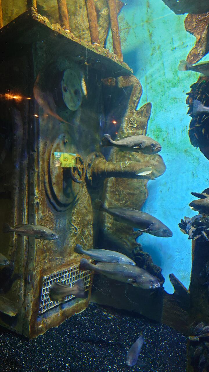 В Аквариуме два этажа, на верхнем много разных аквариумов с разными рыбами, на нижнем - тот самый тоннель и в конце три маленьких, но красивых аквариума.
