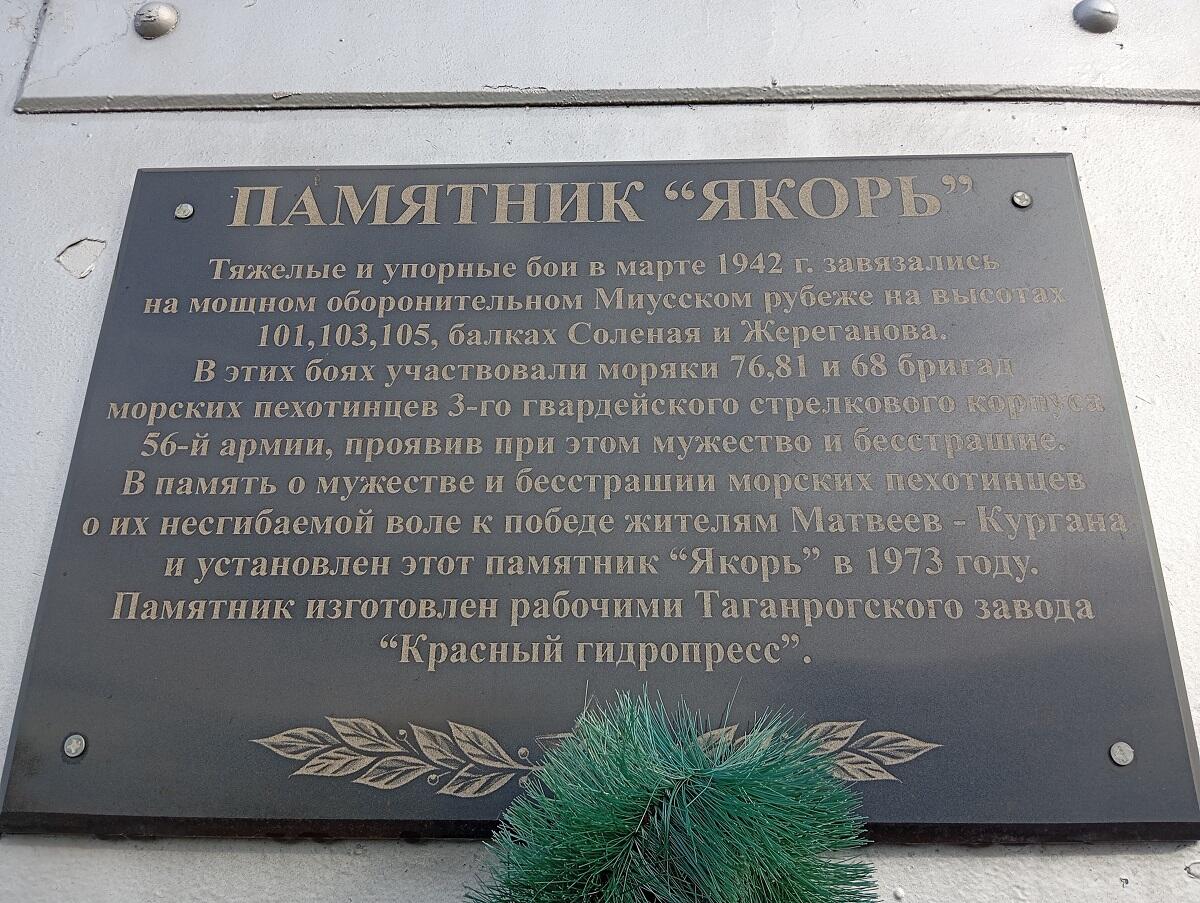 Но в 1973 году, к 30-летию освобождения района на Волковой горе, в пяти километрах к западу от Матвеева Кургана был открыт памятник, увековечивший этот подвиг. 27-метровый якорь изготовлен силами таганрогских заводов «Красный гидропресс» и «Прибой». Его каркас сварен из металлических балок, снаружи якорь покрыт алюминиевыми листами. Снизу по периметру он огорожен якорной цепью.