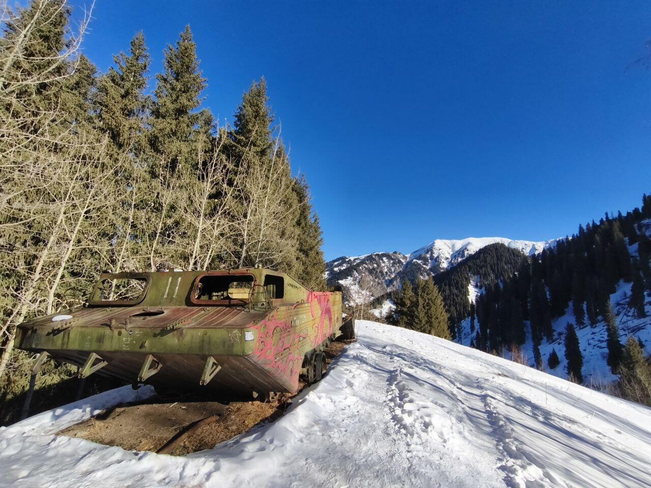 В горах Заилийского Алатау в ущелье Алматы стоит заброшенный вездеход. Машина находится на высоте более 2000 метров на горном хребте в ущелье Ким Асар.