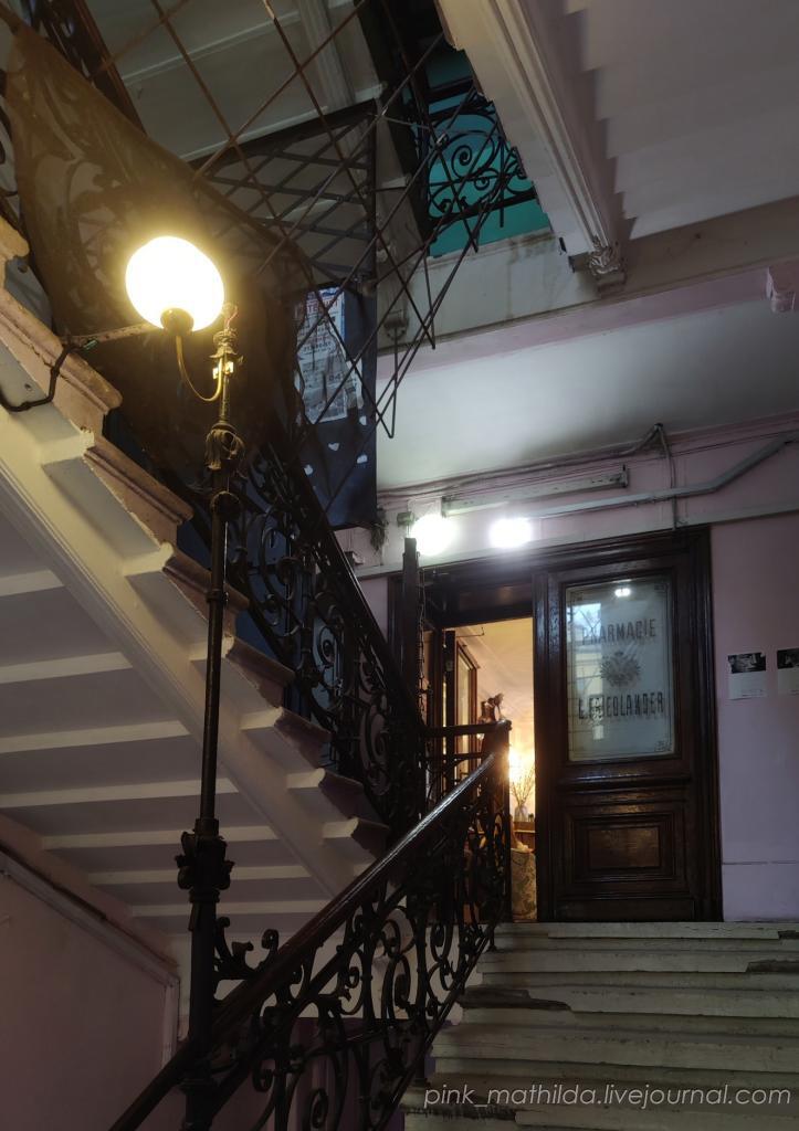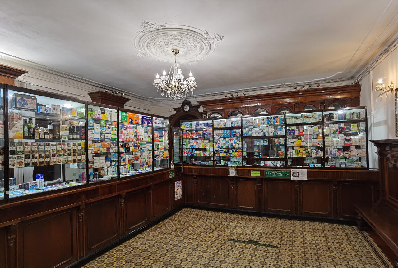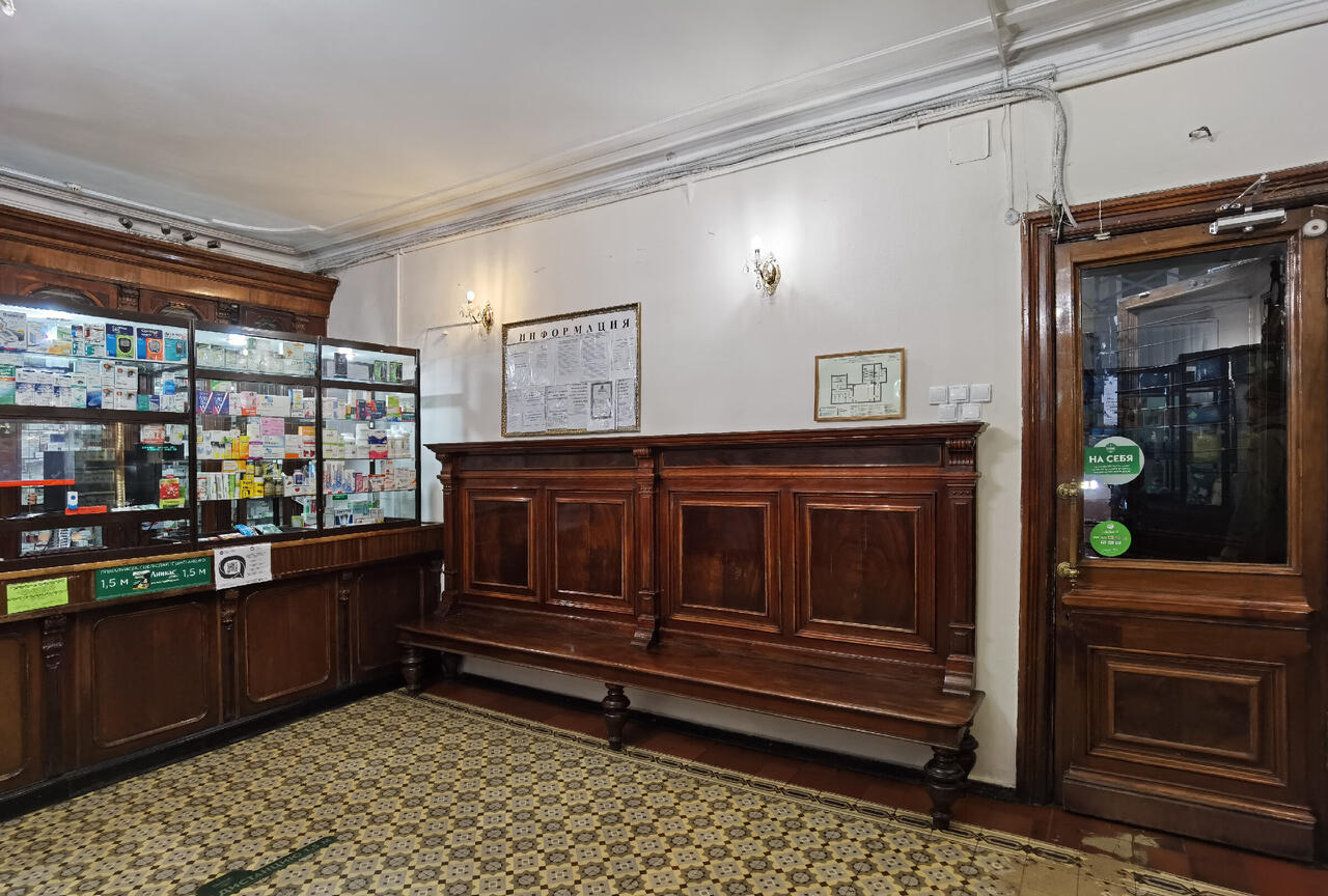 Увы, я не случайно упомянул об аптеке в прошедшем времени, всего пару лет назад она закрылась. С апреля 2025 года здесь работает кофейня-бистро «Opetit Friedlander». Самое любопытное, что новые владельцы постарались сохранить в интерьере историю конца XIX века. На своих местах, как и прежде стоят аптечные шкафы, деревянные прилавки, на полу метлахская плитка, отреставрированная потолочная розетка, часы. Не обошлось и без нововведений: появились люстра с частями в форме ракушек, деревянная резная арка и картины. Всё это хорошо сочетается и дополняет образ.