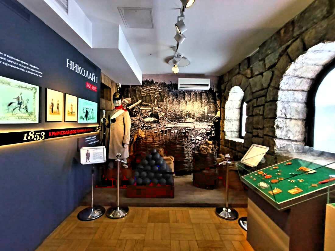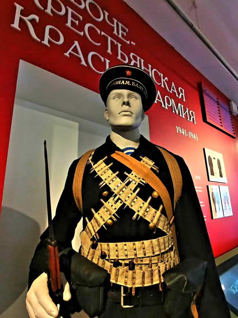 В одном из залов вы окажетесь в цейхгаузе, где на электронном экране сможете сами раскроить форму из различных частей обмундирования. Интересно!