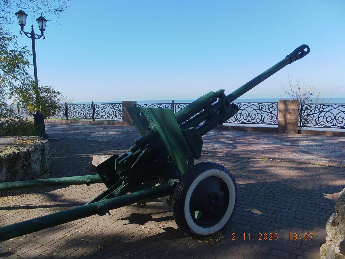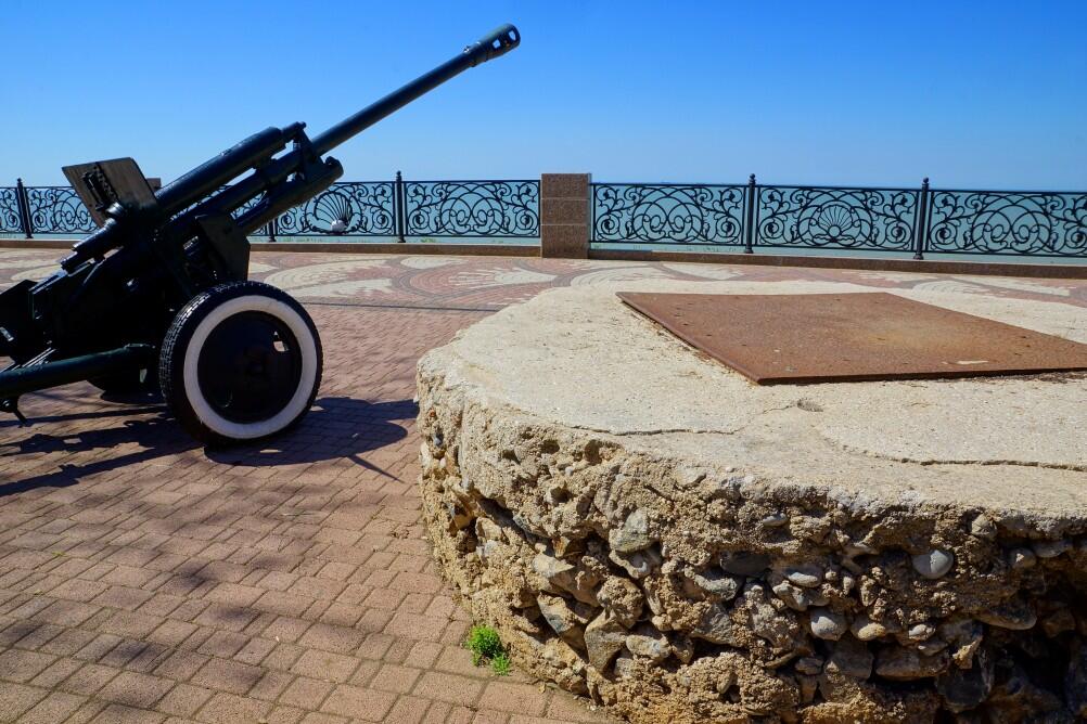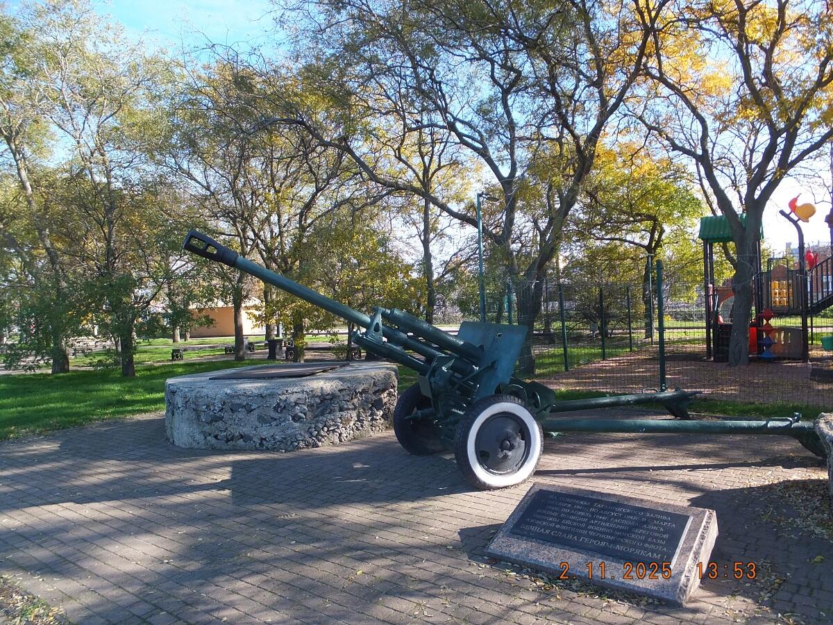 На набережной города Ейска, недалеко от порта, установлен мемориал артиллеристам береговой обороны. Памятная доска с текстом "На побережье Таганрогского залива с октября 1941 г. по август 1942 г. и с марта 1943 г. по апрель 1944 г. располагались боевые позиции артиллерии береговой обороны Ейской ВМБ Азовской флотилии Черноморского Флота. Вечная слава героям - морякам!" и пушка ЗИС-3. Но очень интересны не она, а две бетонные "таблетки" с двух сторон от нее.