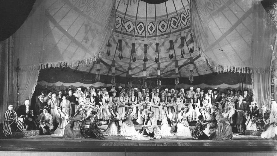 Первым композитором театра стал Е. Брусиловский, на чьем счету знаменитые оперы «Кыз-Жибек», «Ер-Таргын», «Жалбыр» и др. На сцене театра помимо казахских спектаклей («Абай», «Биржан и Сара», «Дударай», «Камар-сулу», «Алпамыс» и др.) ставились и прославленные пьесы русских и зарубежных классиков, в том числе и на казахском языке. Среди них «Фауст», «Пиковая дама», «Аида», «Евгений Онегин». Партии для этих произведений специально переводились на государственный язык. А театральную труппу составляли легендарные артисты того времени.