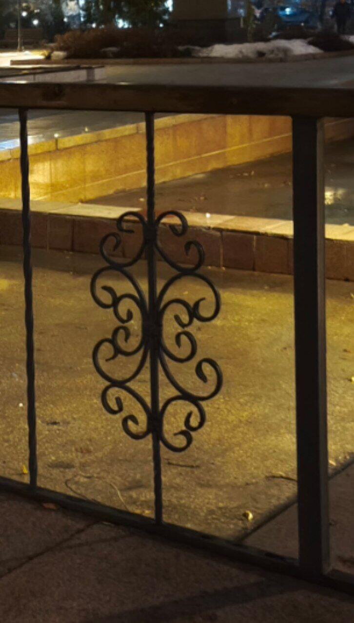 Площадка перед зданием оборудована фонтанами и фонарями с часами (раньше тут стоял памятник Сталину).
