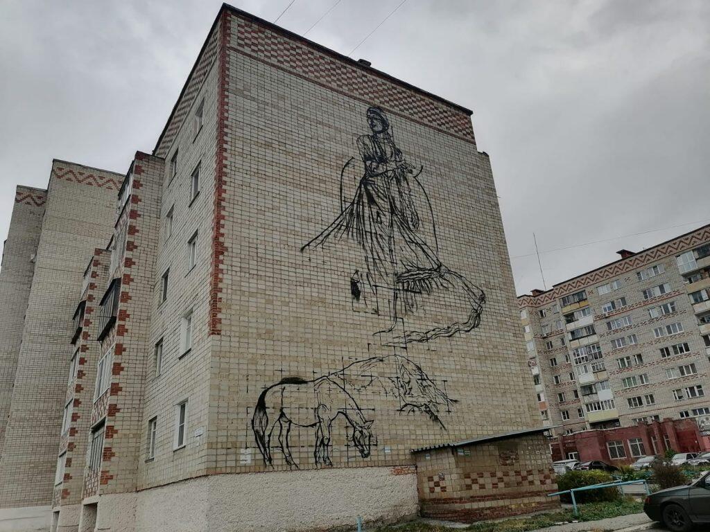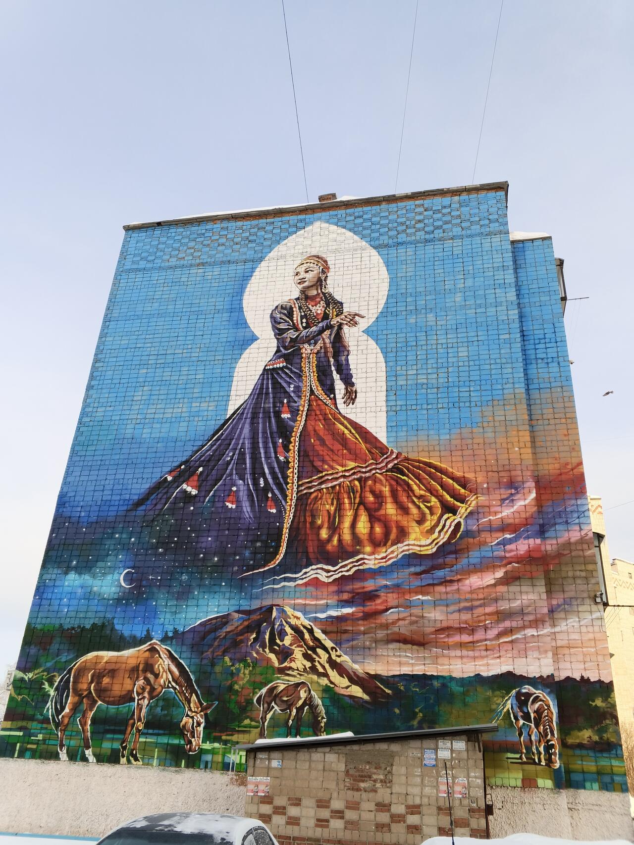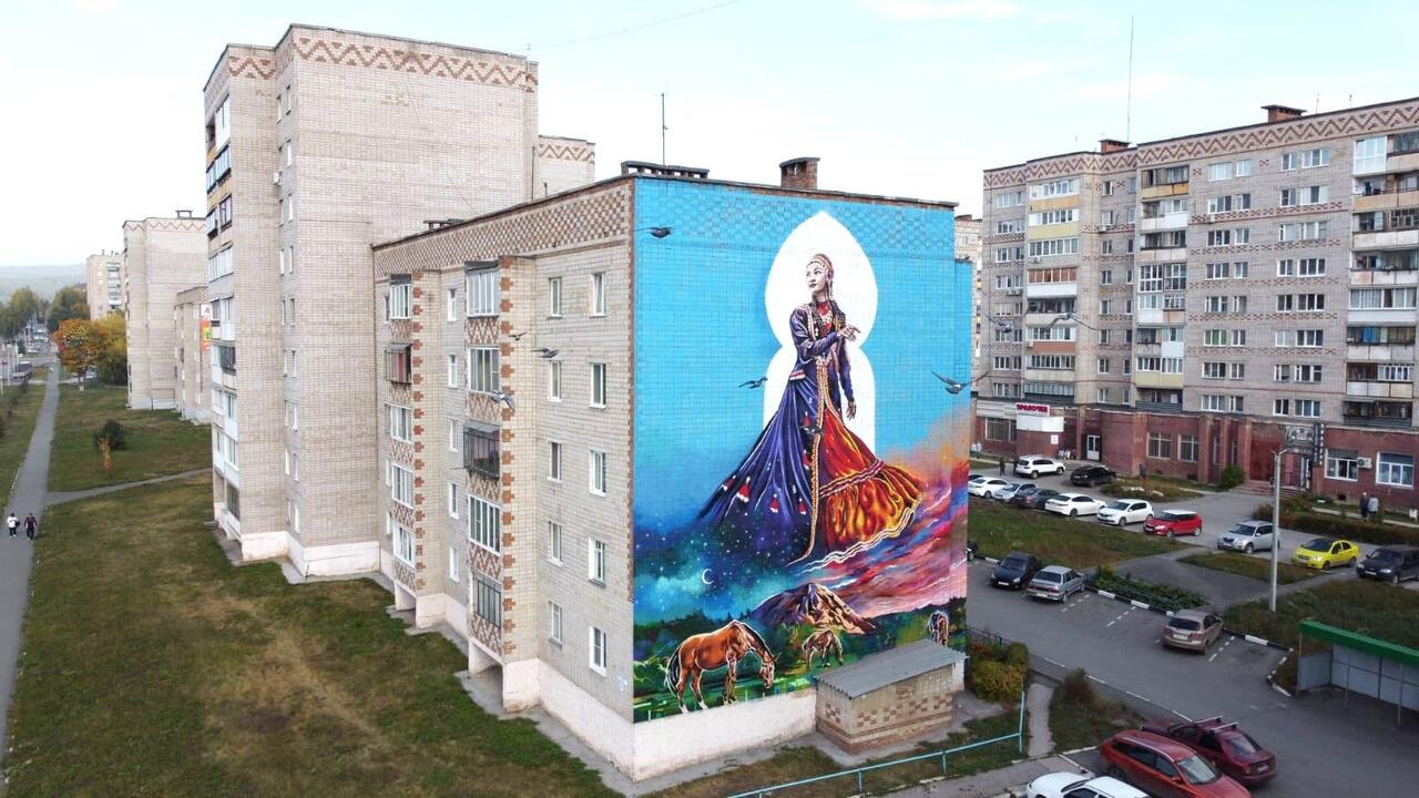 На фасаде одного из домов по улице Кирова в Белорецке появилась красочная картина. Она называется «Покровительница кочевников» и занимает площадь в 220 квадратных метров. Молодой уфимский художник Артур Музипов изобразил башкирскую красавицу. Получился настоящий подарок белоречанам ко Дню Республики.