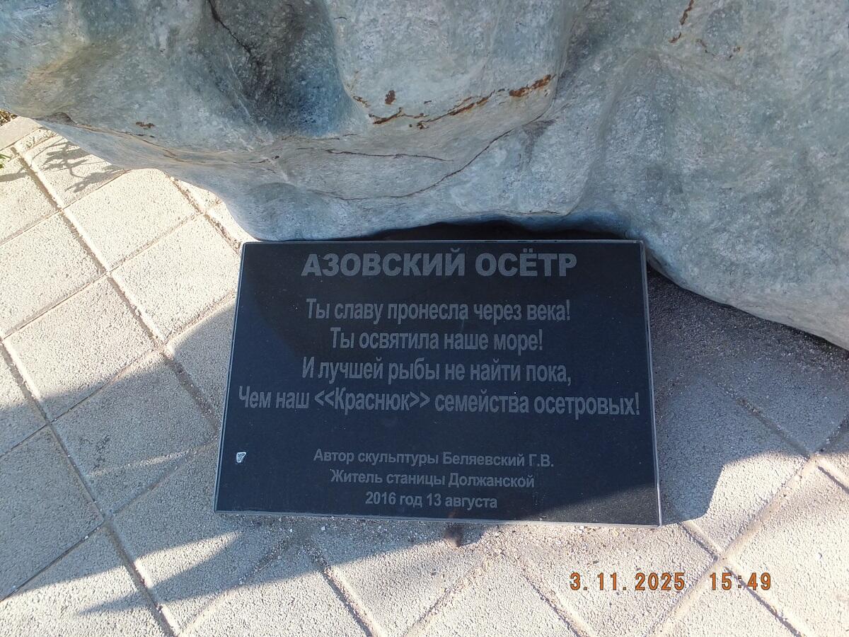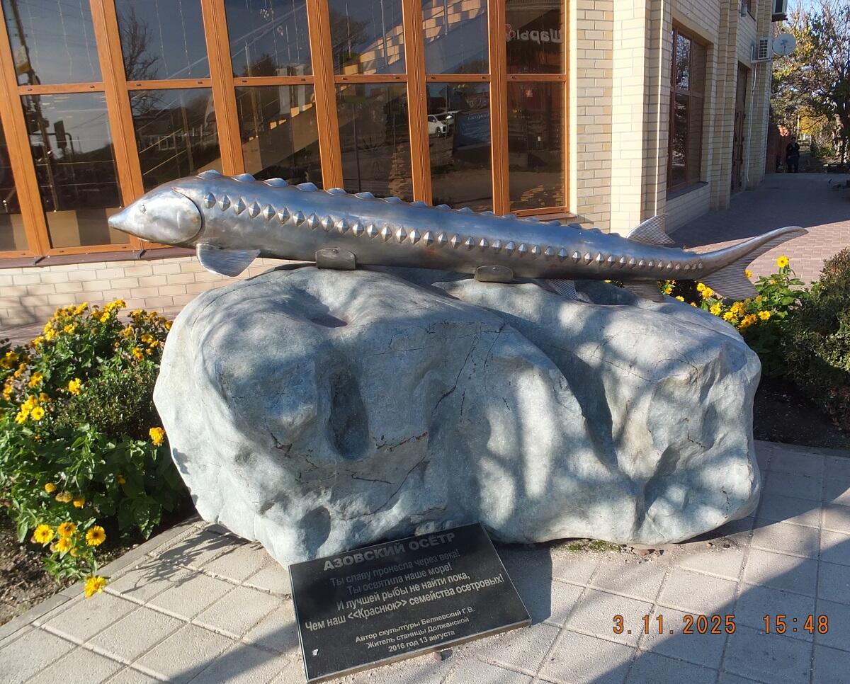 Памятник азовскому осетру открыли в станице Должанской в 2016 году, приурочив это событие к удивительно некруглой дате - 168-ой годовщине основания муниципалитета. Объект для инсталляции выбрали неслучайно — замечательная рыба когда-то в изобилии водилась в окрестных водоемах и занимала почетное место на праздничном столе казаков.