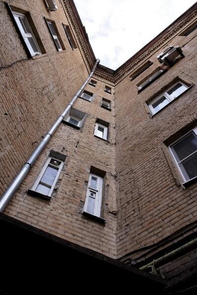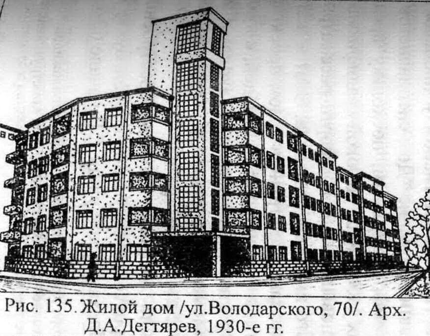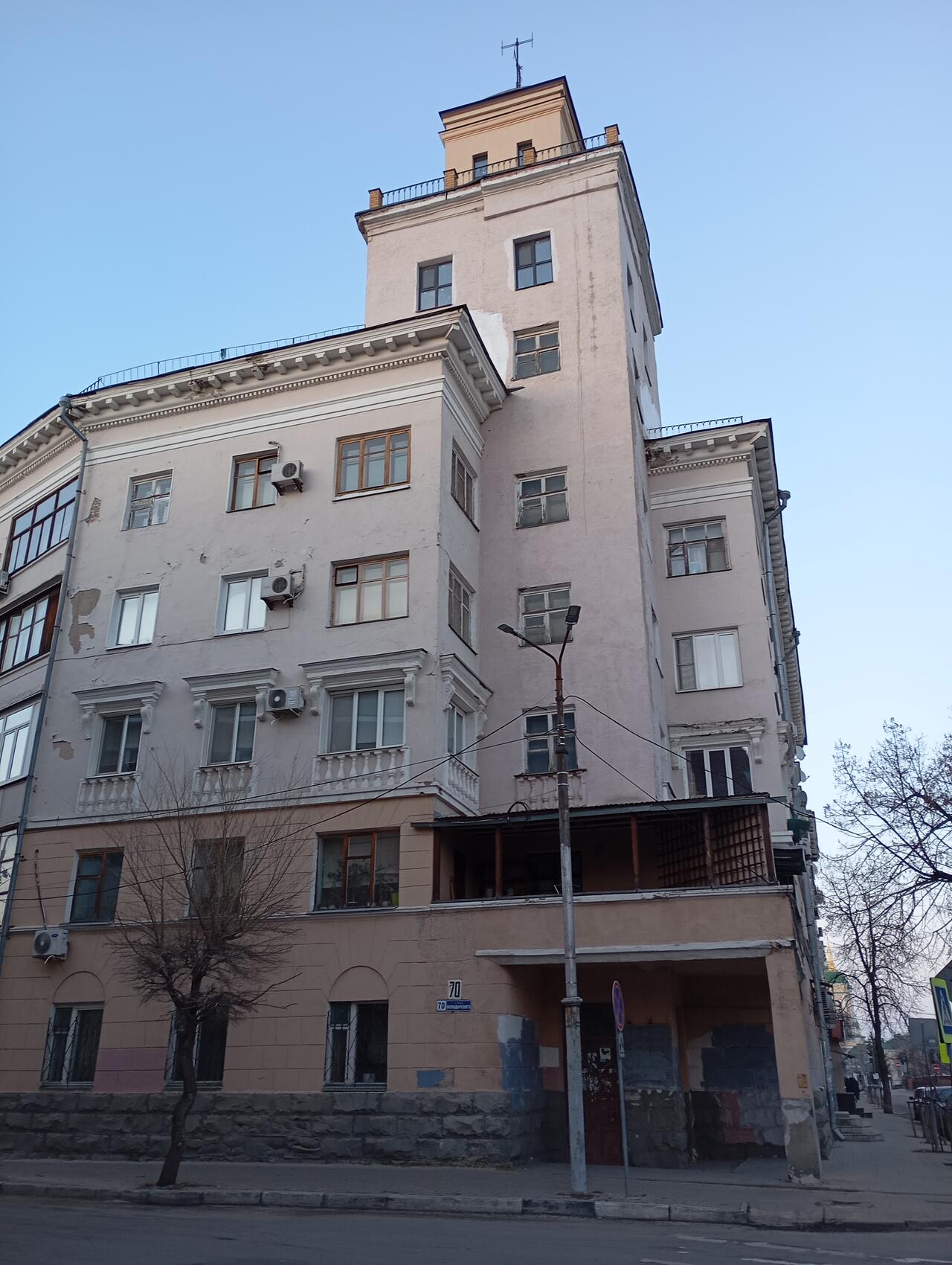 Пятиэтажку на улице Володарского, 70 возводили в стиле модного тогда конструктивизма: высокие кирпичные стены, огромные окна (их частично заложили в конце 40-х), остекленная башенка, шикарный главный подъезд с широкой лестницей, сдвоенные лоджии. Квартиры тут огромные и по нынешним меркам – больше 120 кв. м на три комнаты. Дом был полностью автономным: своя водонапорная башня, котельная, во дворе – санчасть, детский сад, магазин, еще один магазин со стороны улицы.