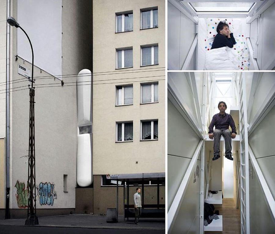 Самый, пожалуй, наглядный пример – это Keret House в Варшаве. Дом был так назван в честь израильского писателя и кинорежиссера Этгара Керета, который был первым арендатором здания. Минимальная ширина дома составляет 92 см, а максимальная – 152 см. Несмотря на столь крохотные габариты, в доме есть всё необходимое для жизни. Домик втиснулся в полутораметровую щель между двумя многоквартирными домами. Здание установлено на металлических подпорках. Каркас выполнен из металла, а полупрозрачная крыша – из поликарбоната. По законодательству Польши такое узкое здание не может считаться жилым, поэтому Keret House признан арт-объектом.