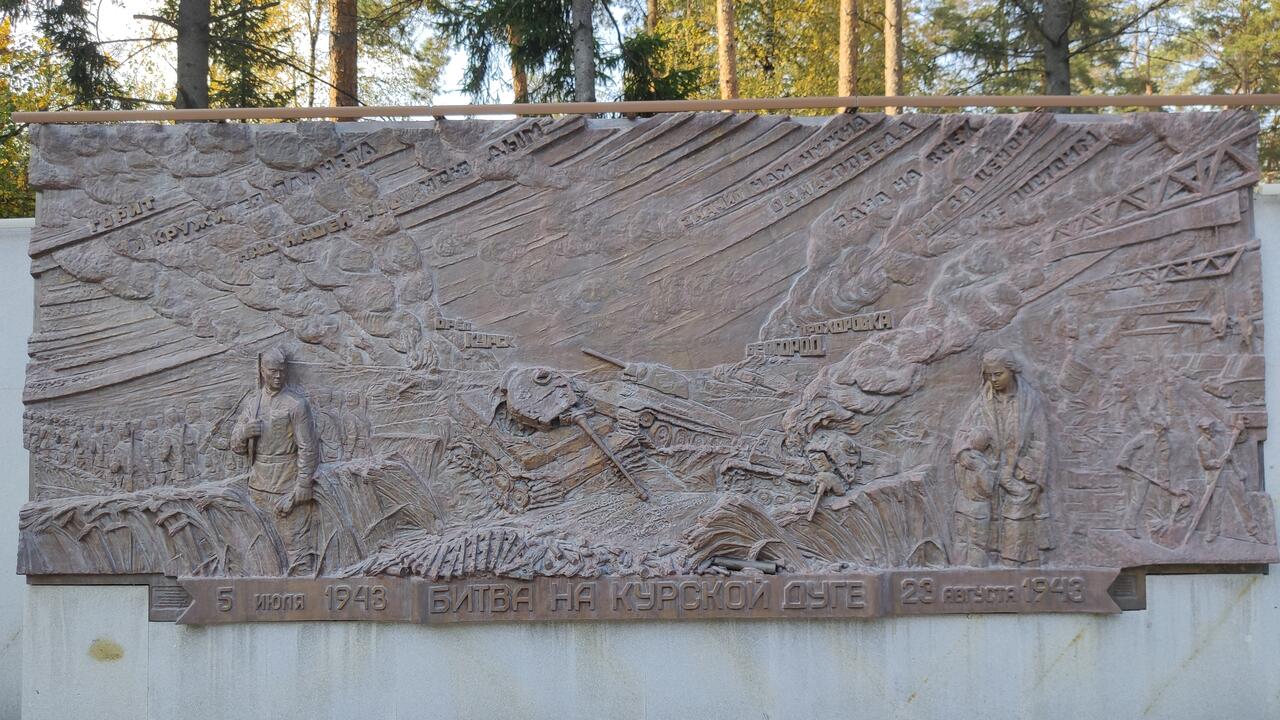 - В барельеф «Битва на Курской дуге» вплавлены настоящие гильзы от снарядов, найденные поисковиками под Прохоровкой. Где-то здесь должны быть и звёздочки с офицерских погонов, найденные там же.