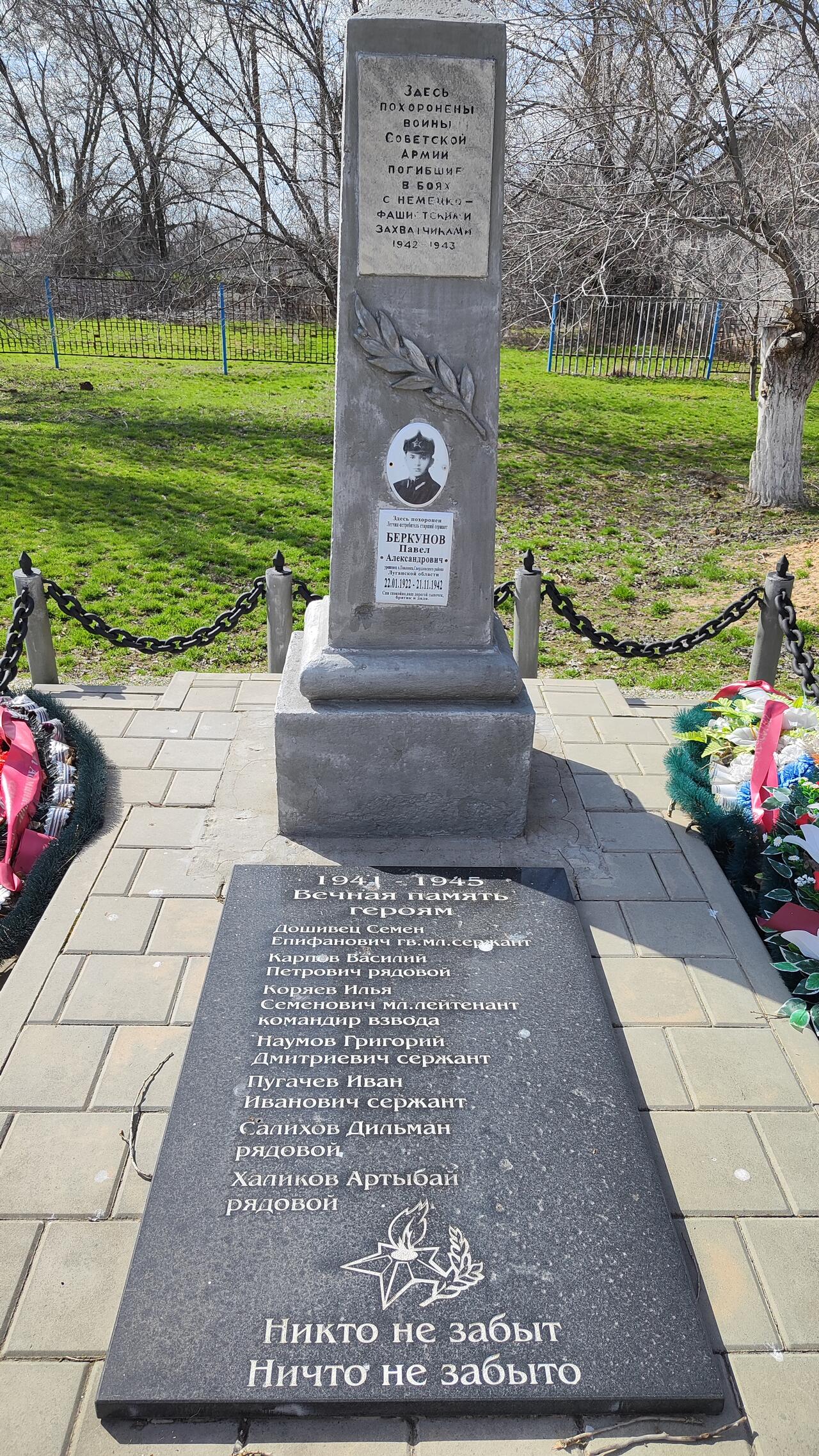 Из всех захороненных в этой братской могиле наиболее широко освещена история летчика-истребителя сержанта Беркунова Павла Александровича.