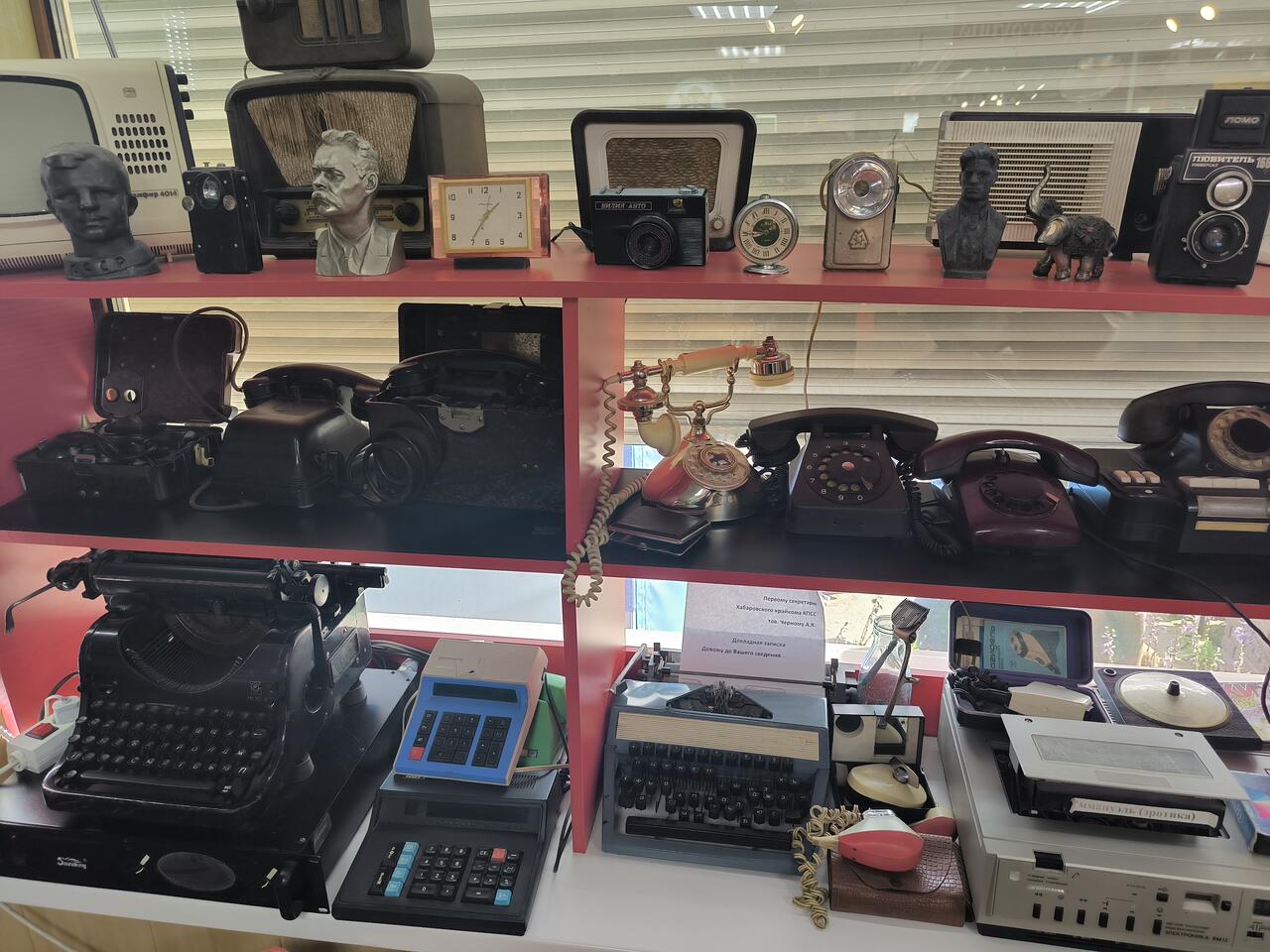 - Очень трудно сосчитать все экспонаты, что тут есть. Их огромное количество, начиная от монет и значков и заканчивая достаточно крупными предметами. У нас много советской бытовой техники, линейка старых телефонных аппаратов. Есть много предметов повседневного использования советского гражданина. Даже есть колбы, которые должны помнить те, кто жил в то время – это такие сосуды на тройном штативе, из которых наливали соки или сиропы. Особое место занимают разные агитационные плакаты, которыми у нас завешены стены. Они очень хорошо передают атмосферу той эпохи. Ещё есть много вымпелов, переходящих знамён, пионерская атрибутика… даже пила «Дружба» есть, - поделился Виктор Рютин.