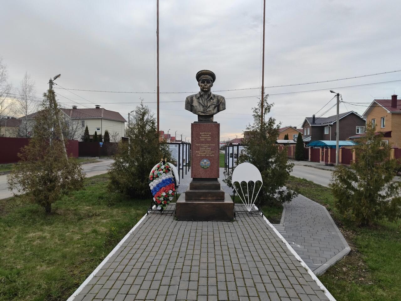 На небольшой ухоженной площадке установлен бюст герою-десантнику. Василий Филиппович запечатлён в парадном мундире с наградами — похож на себя настоящего. Памятник стоит на высоком постаменте, вокруг аккуратная плитка, газоны.