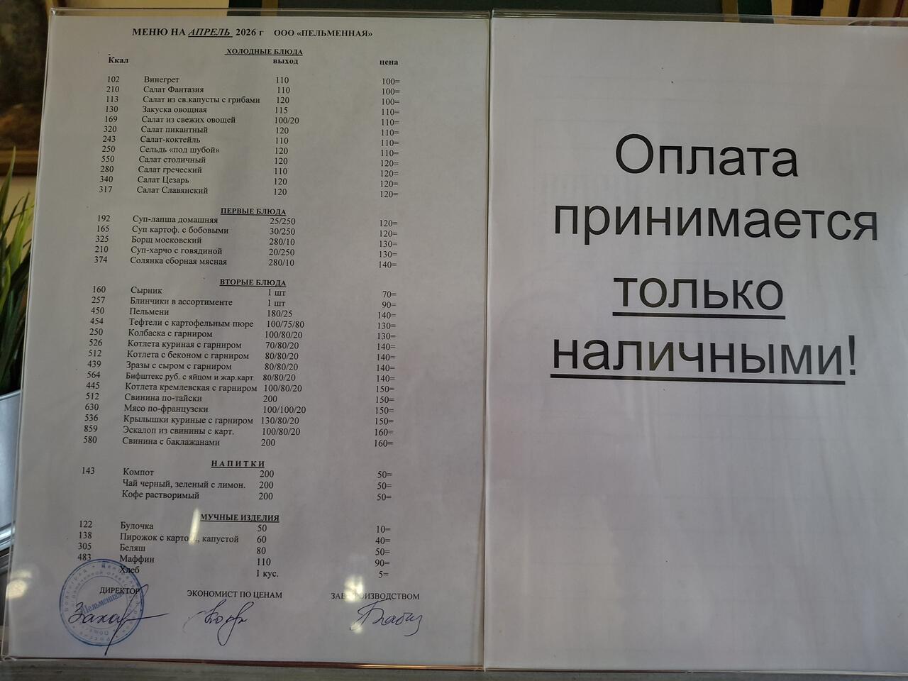 Набор основных блюд не меняется в пельменной десятилетиями: посетителям на выбор предлагается несколько первых и вторых блюд, а также салаты и кондитерские изделия. К счастью, до сих пор осталось хорошее советское наследие: горячий, холодный и мучной цеха. Работники сами пекут так называемые хлебобулочки, булочки с изюмом и орехами и различные слоеные изделия.